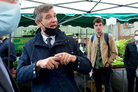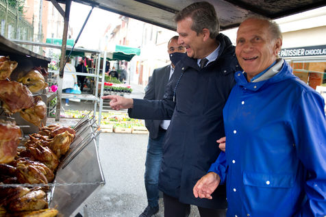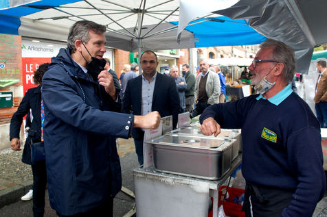 Arnaud Montebourg ancien ministre de l'économie et ancien membre du Parti Socialiste, candidat pour l?élection présidentielle de 2022 visite un marché de haute Garonne.