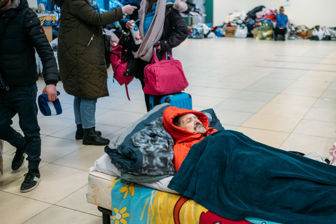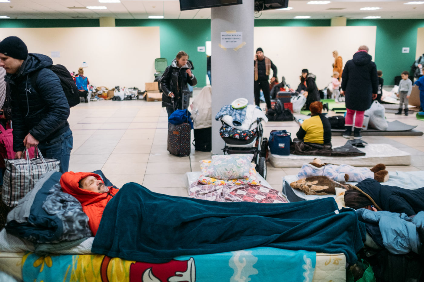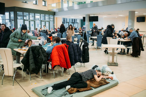 L?aréna Lviv est un stade de 40 000 places, c?est dans ce stade qu'était inaugurée la coupe d?Europe de l?UEFA en 2012. Aujourd?hui, son sous-sol est transformé en un immense centre d?accueil ou les réfugiés de l?est et de Kyiv prennent un moment de repos, un repas et un peu de chaleur avant l?exode vers l?Europe.