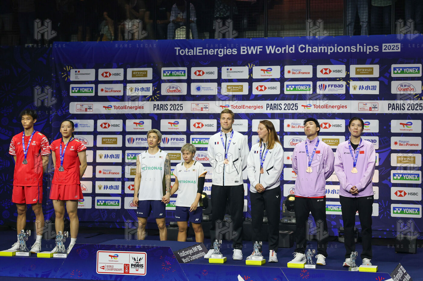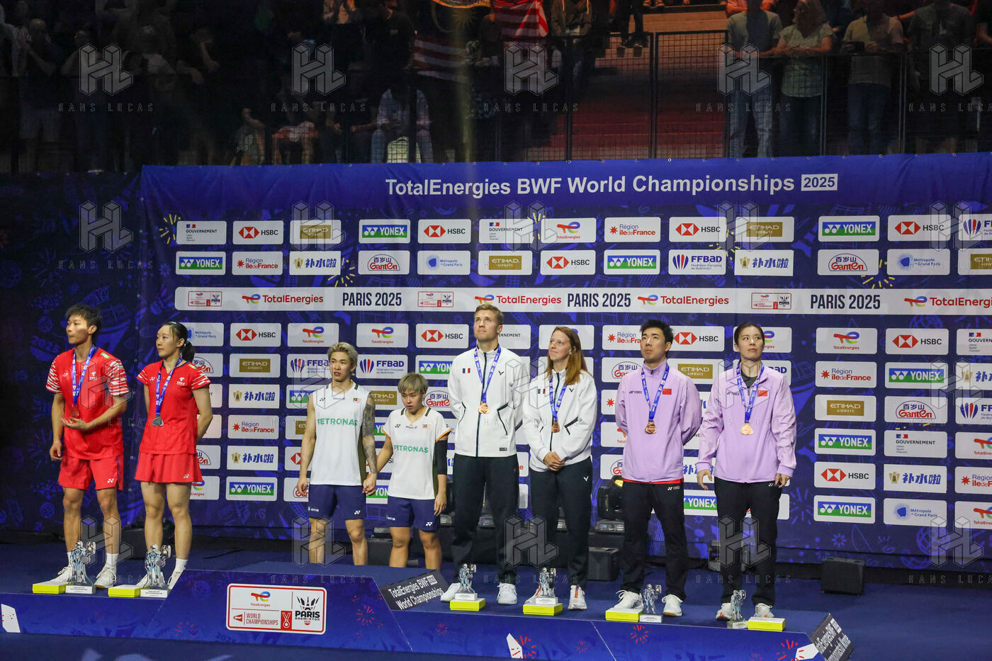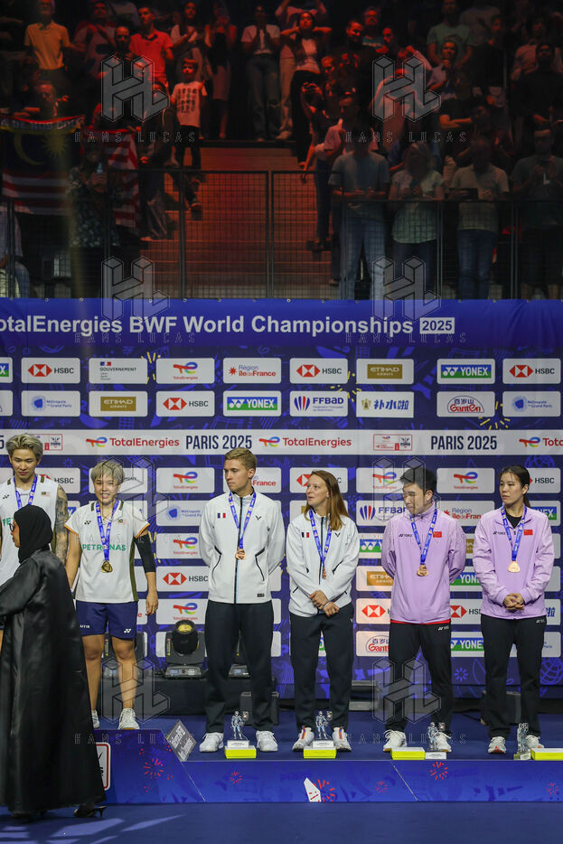 Photos of the various podiums at the 2025 Badminton World Championships, which took place from Monday 25 to Sunday 31 August 2025 in Paris at the Adidas Arena.