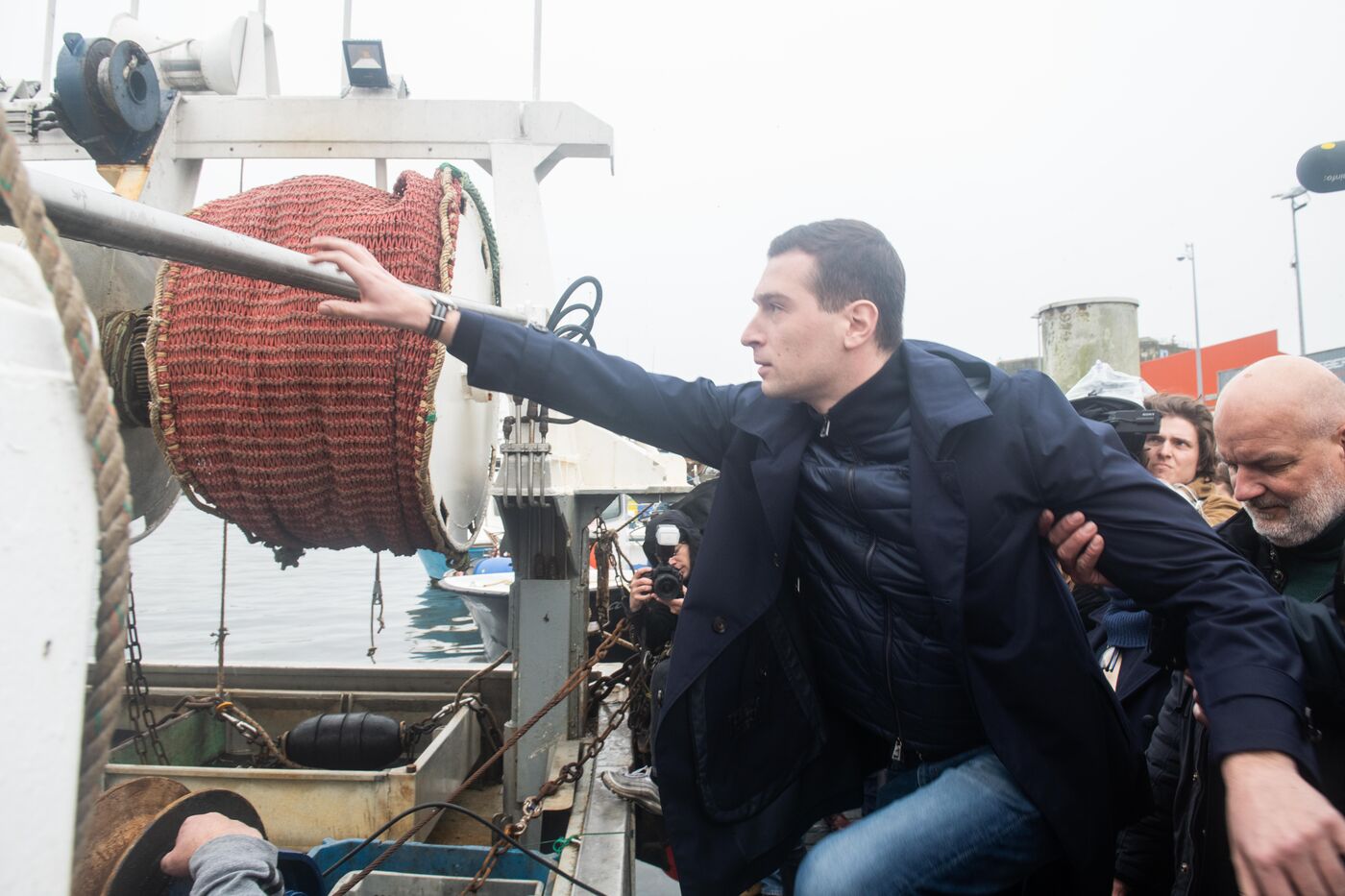 Jordan Bardella, President of the Rassemblement National (RN), came to meet fishermen in Lorient, Brittany's main fishing port. He was welcomed by David Le Quintrec, a gillnetter from Lorient, who explained to him, among other things, the constraints weighing on their activity, such as the month-long ban on fishing in the Bay of Biscay to preserve dolphins.