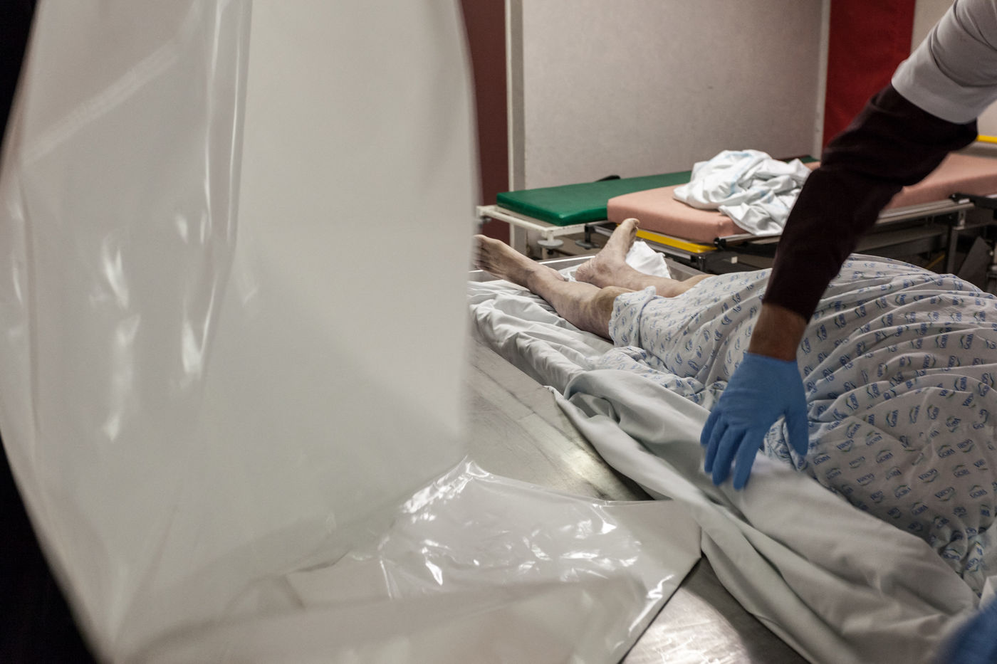 Lorsque quelqu'un décède dans un service, les infirmiers de la chambre mortuaire vont chercher le corps dans l'hôpital, le transfère dans une housse hygiénique blanche et le ramène vers la chambre mortuaire en traversant l'hôpital.