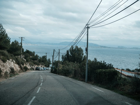 Des conteneurs entassés, une carcasse de voiture brûlée et des yatch qui regardent les voitures passer. Aller vers la calanque de Niolon, hors saison. Quelques chats, quatre jeunes qui vont pêcher, la baie pleine de déchets plastiques et cette eau translucide où l on peut voir les oursins. Sortir de la calanque et s enfoncer sur la falaise sur un chemin qui n?existe pas; l odeur des pins entêtante, le cri des mouettes qui nichent pas loin et l eau qui se fracasse contre la roche. Faire un tour aux calanques de Mejean a l'heure ou le soleil disparait derriere l'horizon.