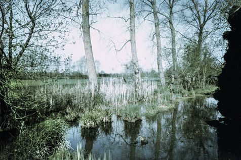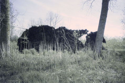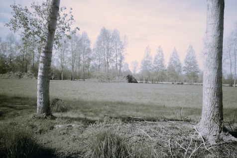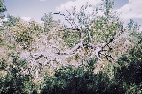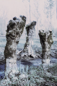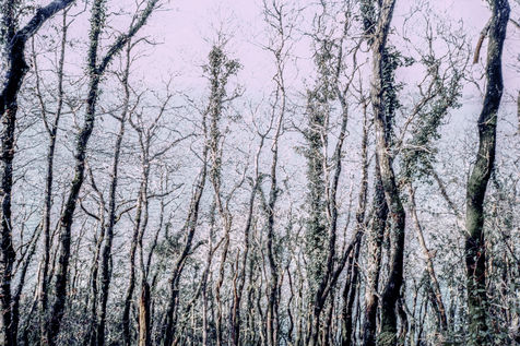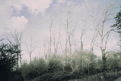 The back of the trees from one bank to another back and forth, eyes turned to the sky (against the sky, the tops) at full length their body to the ground shades of gray - something a bit bland - arms dangling, erring ways, and numbing halftone cries, memory of crying upon waking trees on land arms dangling, (on shooting, she often cuts off their arms or feet, uncertain holding, a little soft) she tells herself she’s always repeating the same little phrases, but speaks to them very little from one to the other - between two waters –