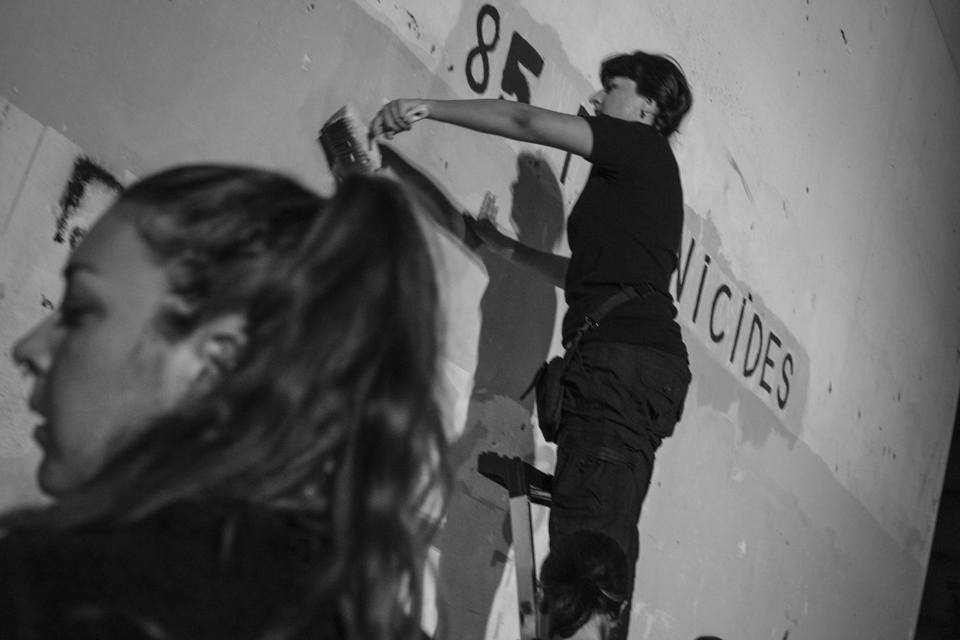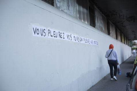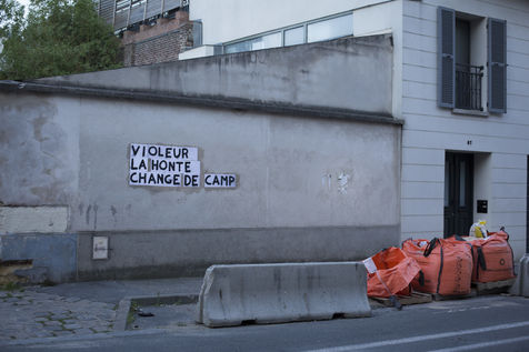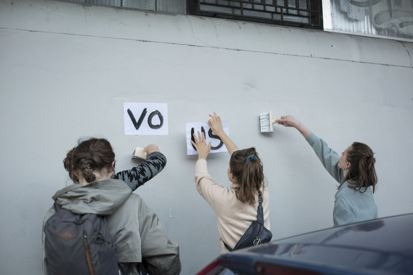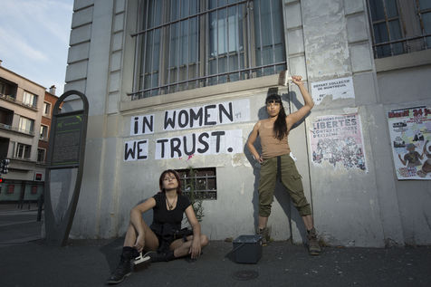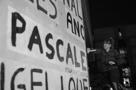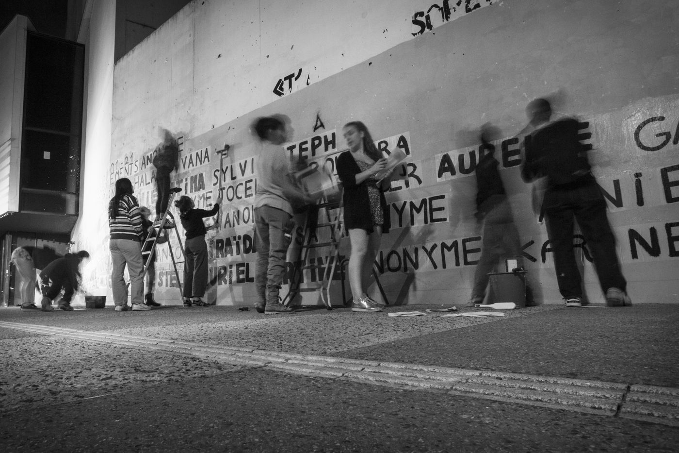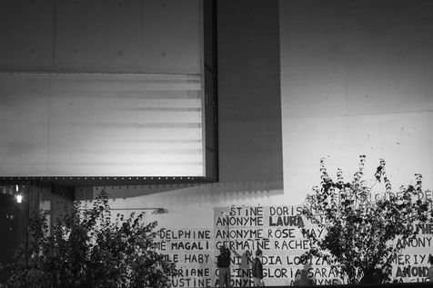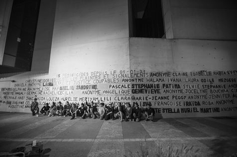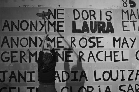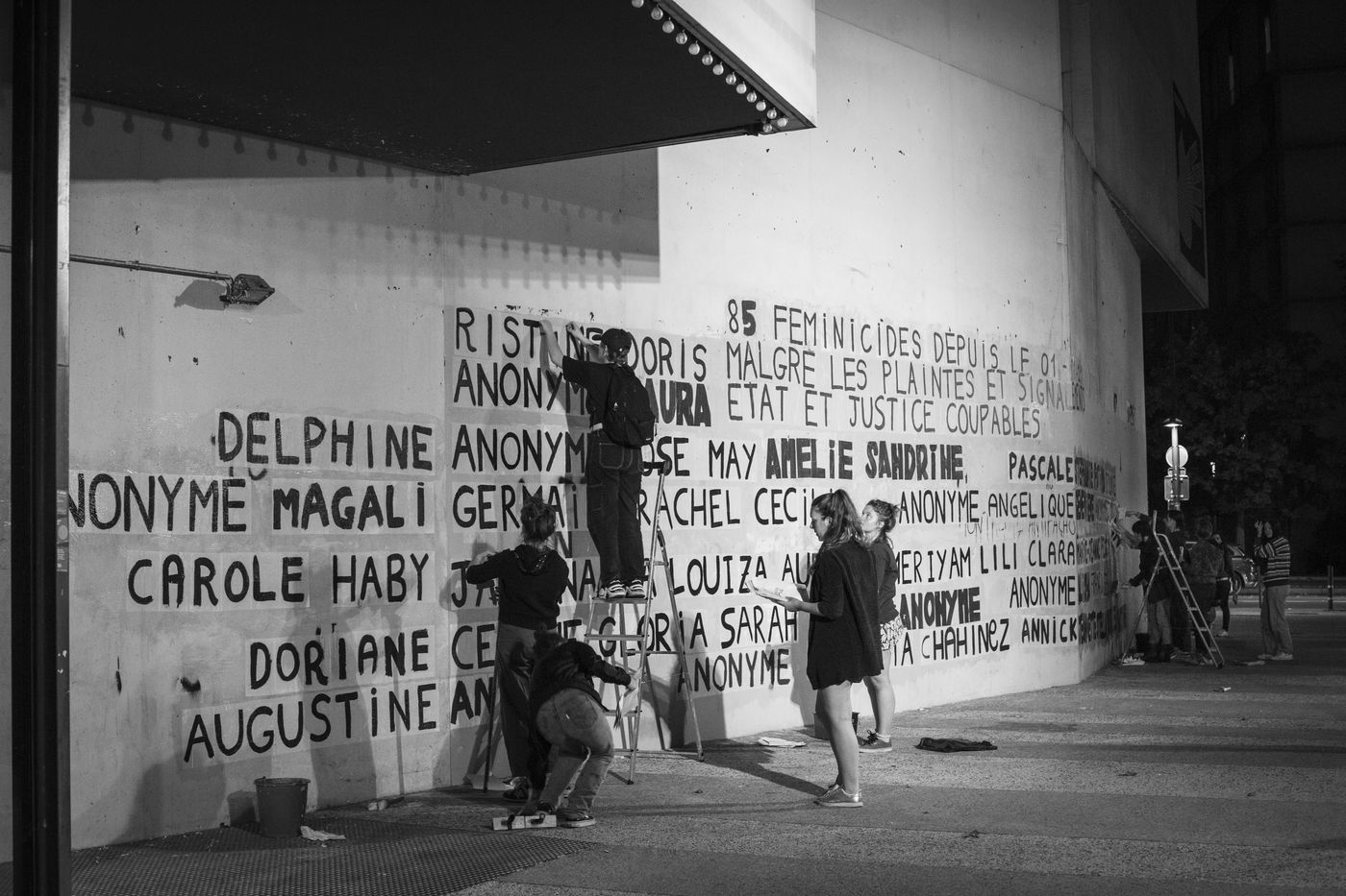 Their names are Louise, Ana, Alice, Leila, Lola ... These activists have joined the group of gluers founded by Margeritte Stern. They denounce the feminicides in France through white A4 sheets where black letters are painted by hand. According to criteria of textures and location, the gluers launch themselves with precision and speed to glue. Quickly, each one has its role for each sentence. One passes a first brush stroke, the second lays out the third goes over while a fourth guesses.
