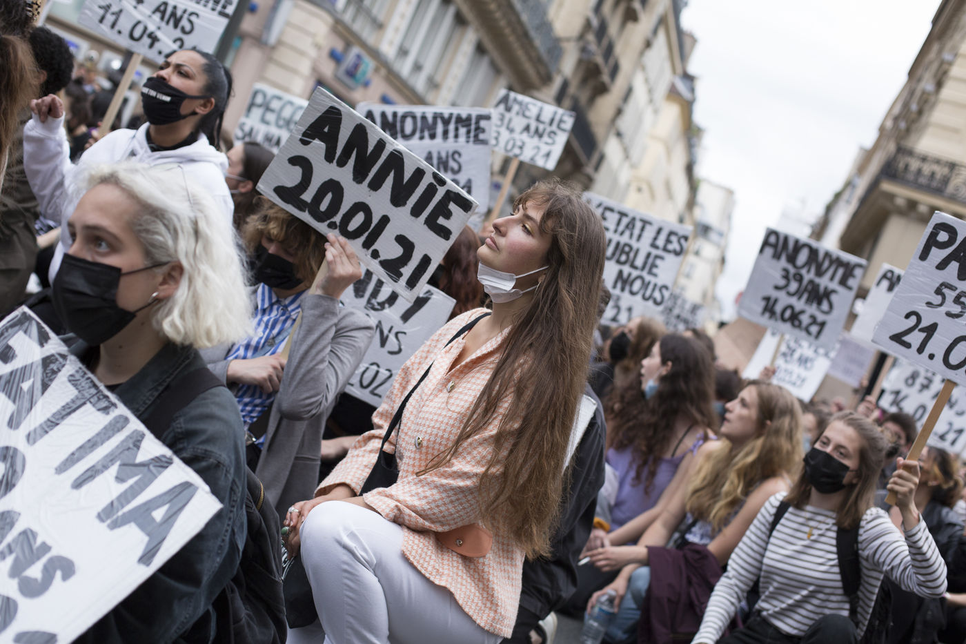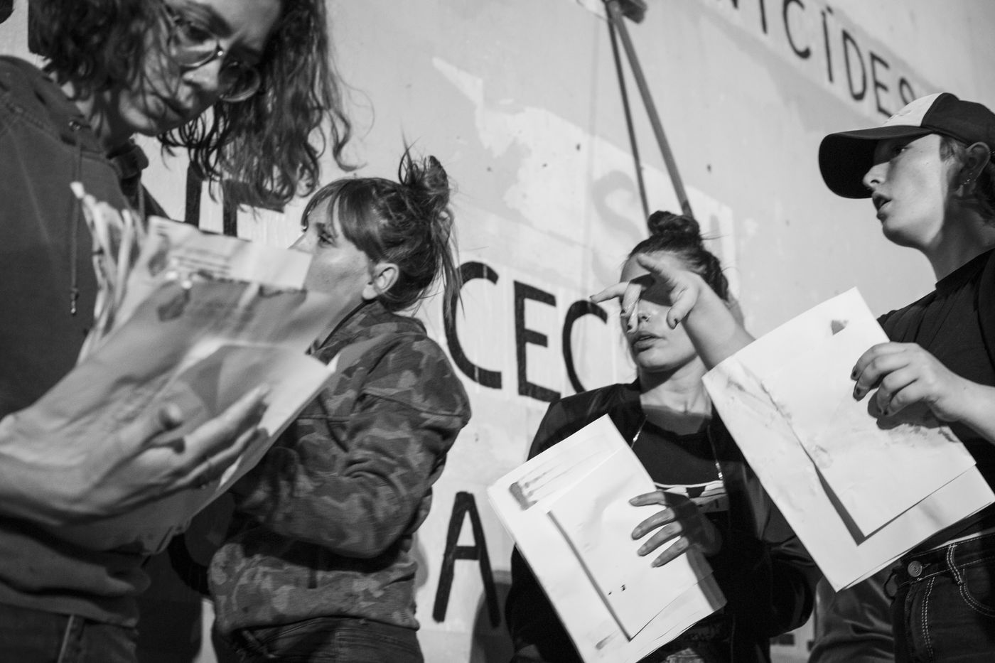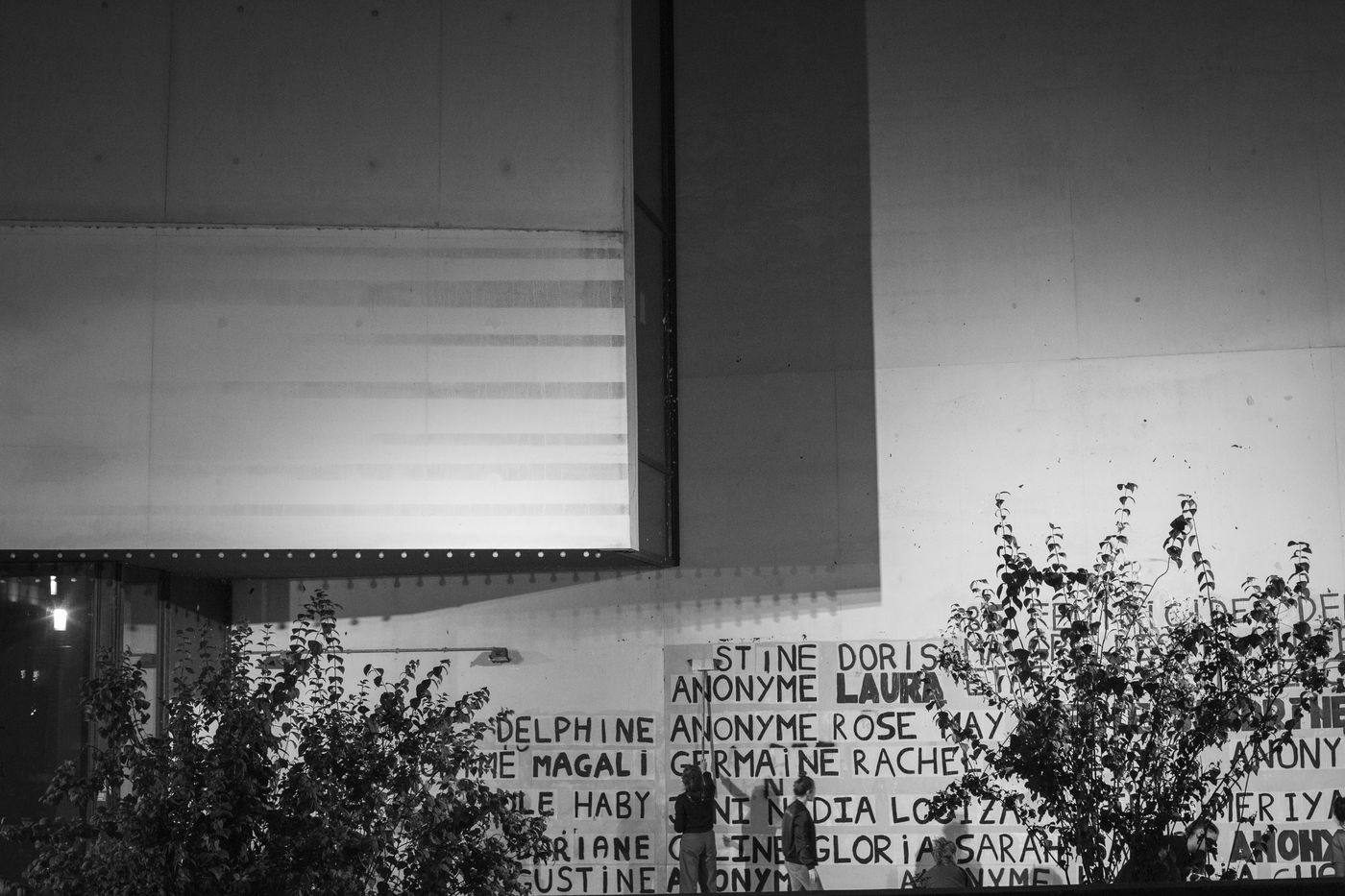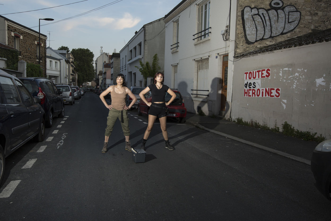 Their names are Louise, Ana, Alice, Leila, Lola ... These activists have joined the group of gluers founded by Margeritte Stern. They denounce the feminicides in France through white A4 sheets where black letters are painted by hand. According to criteria of textures and location, the gluers launch themselves with precision and speed to glue. Quickly, each one has its role for each sentence. One passes a first brush stroke, the second lays out the third goes over while a fourth guesses.