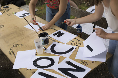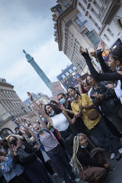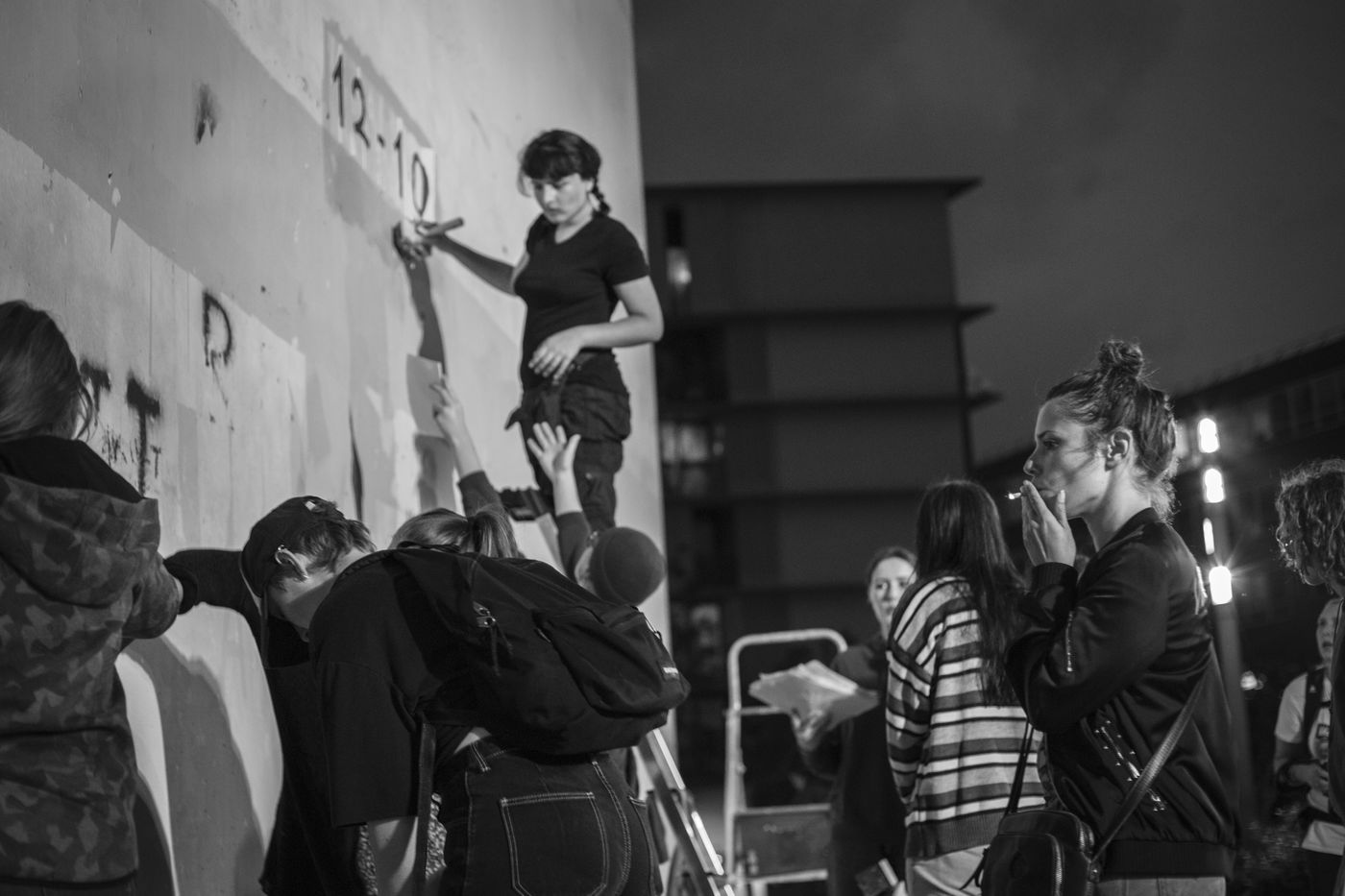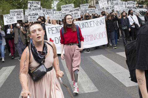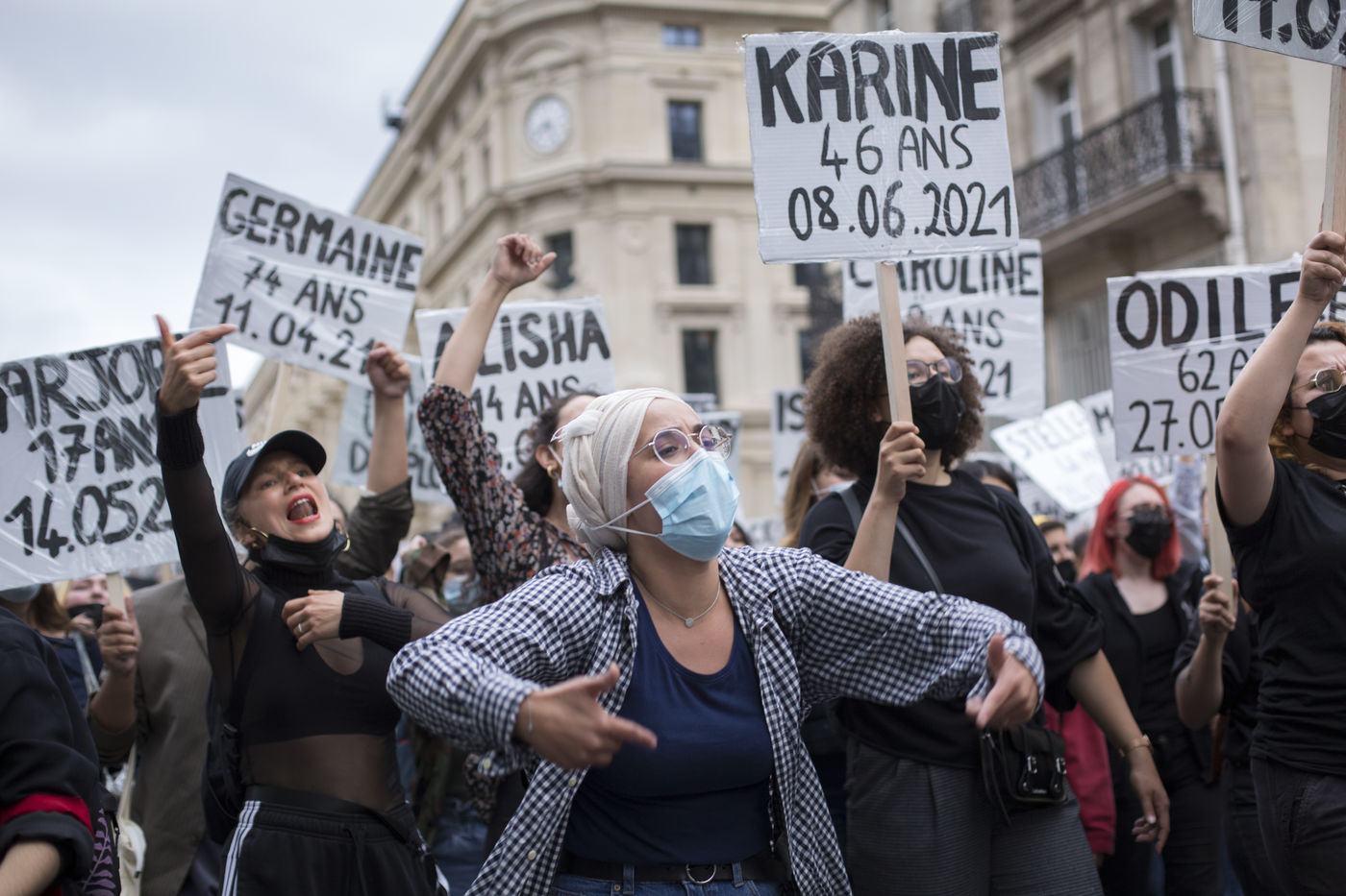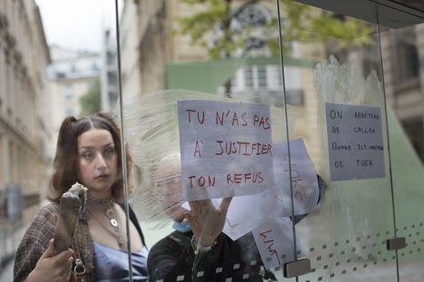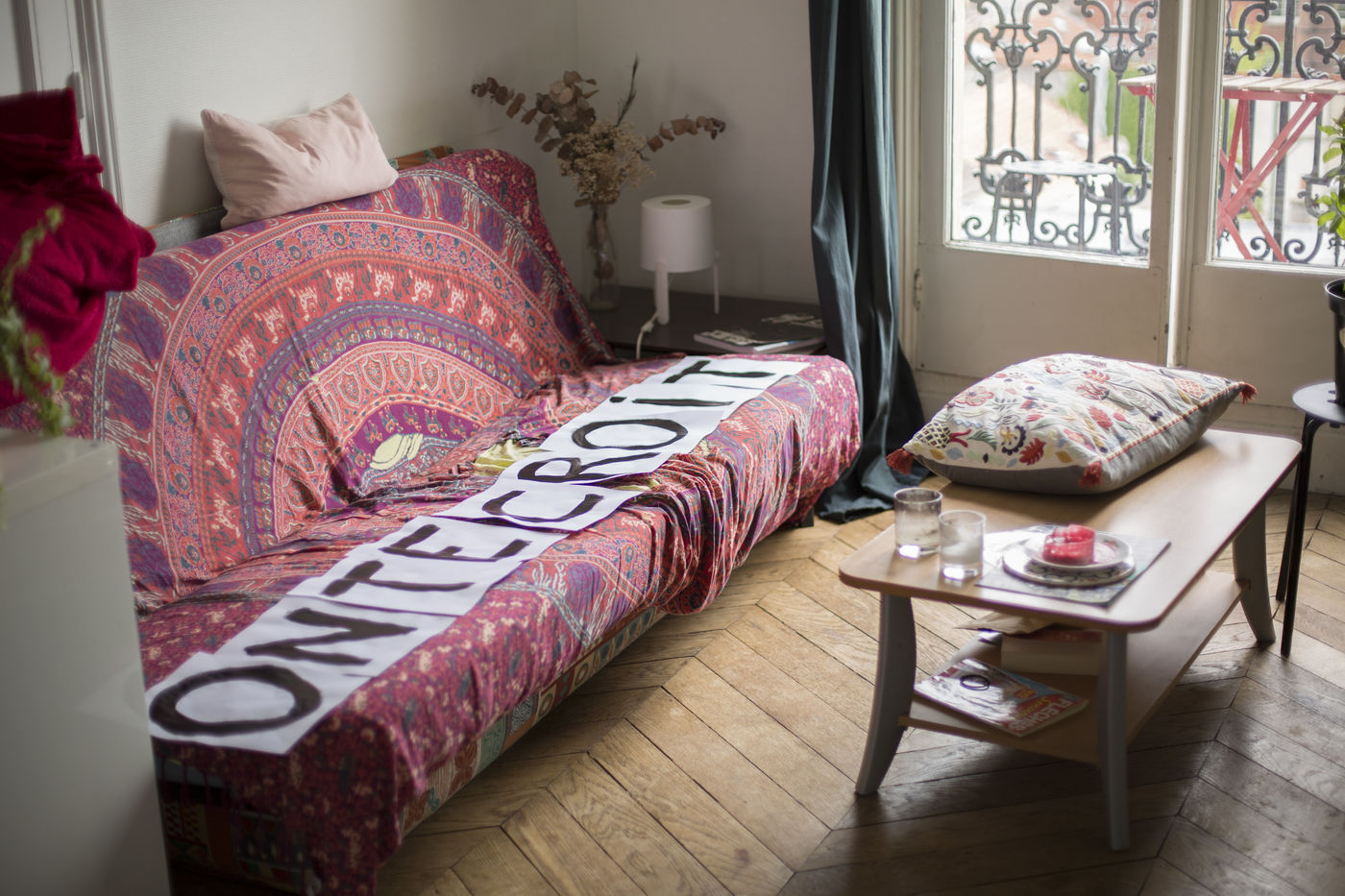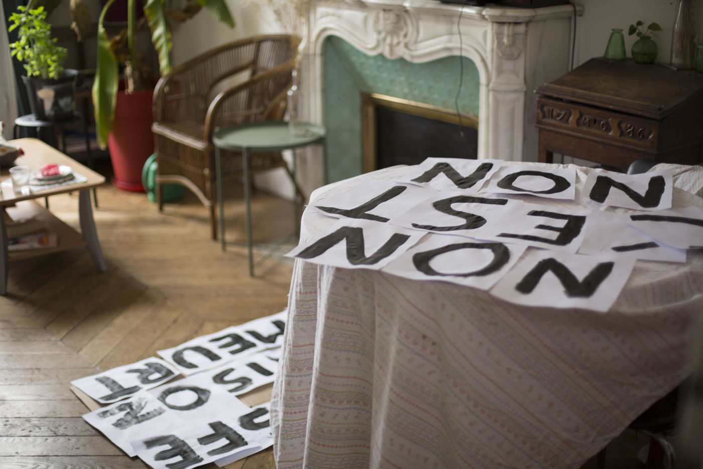 Their names are Louise, Ana, Alice, Leila, Lola ... These activists have joined the group of gluers founded by Margeritte Stern. They denounce the feminicides in France through white A4 sheets where black letters are painted by hand. According to criteria of textures and location, the gluers launch themselves with precision and speed to glue. Quickly, each one has its role for each sentence. One passes a first brush stroke, the second lays out the third goes over while a fourth guesses.