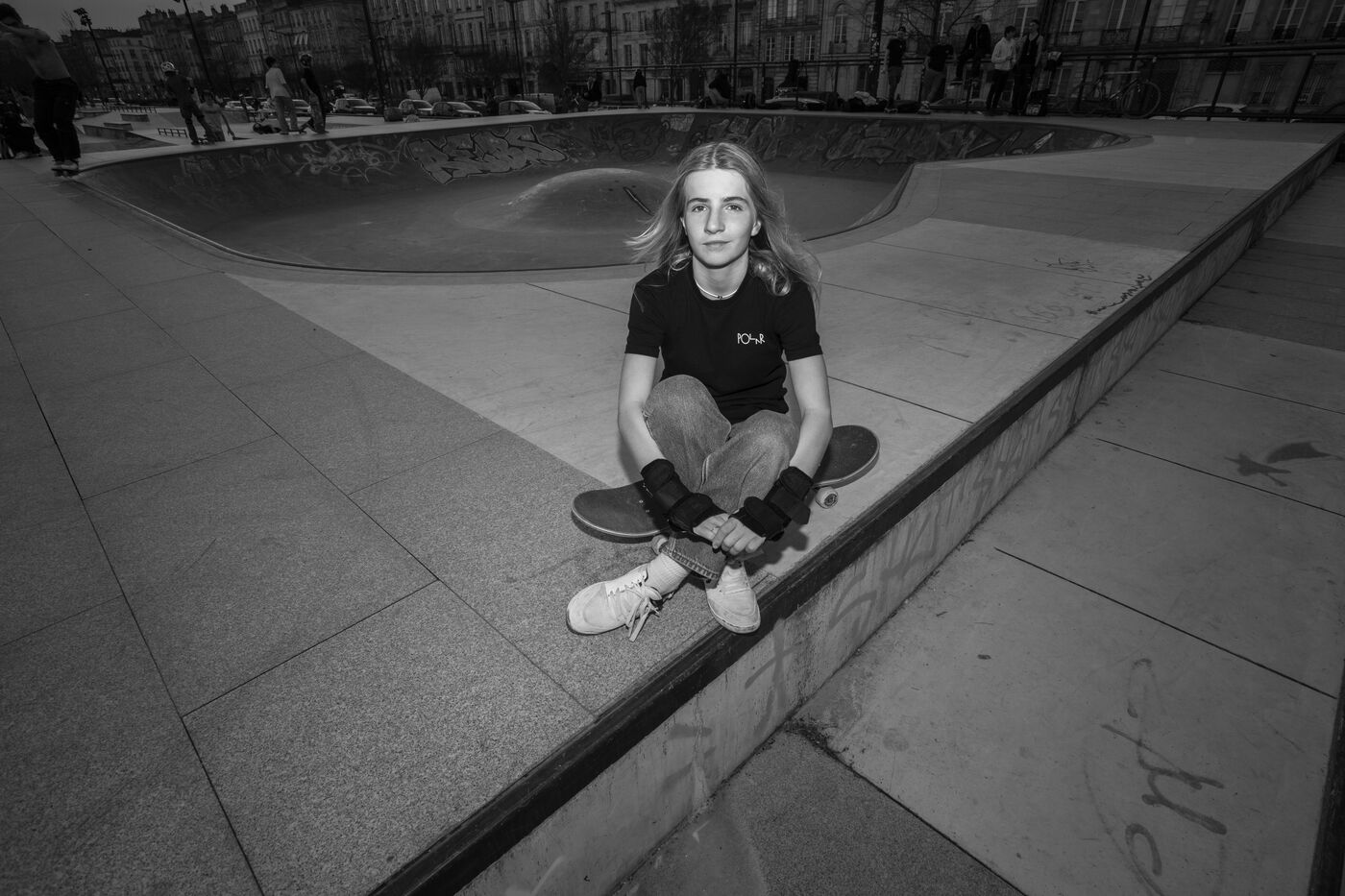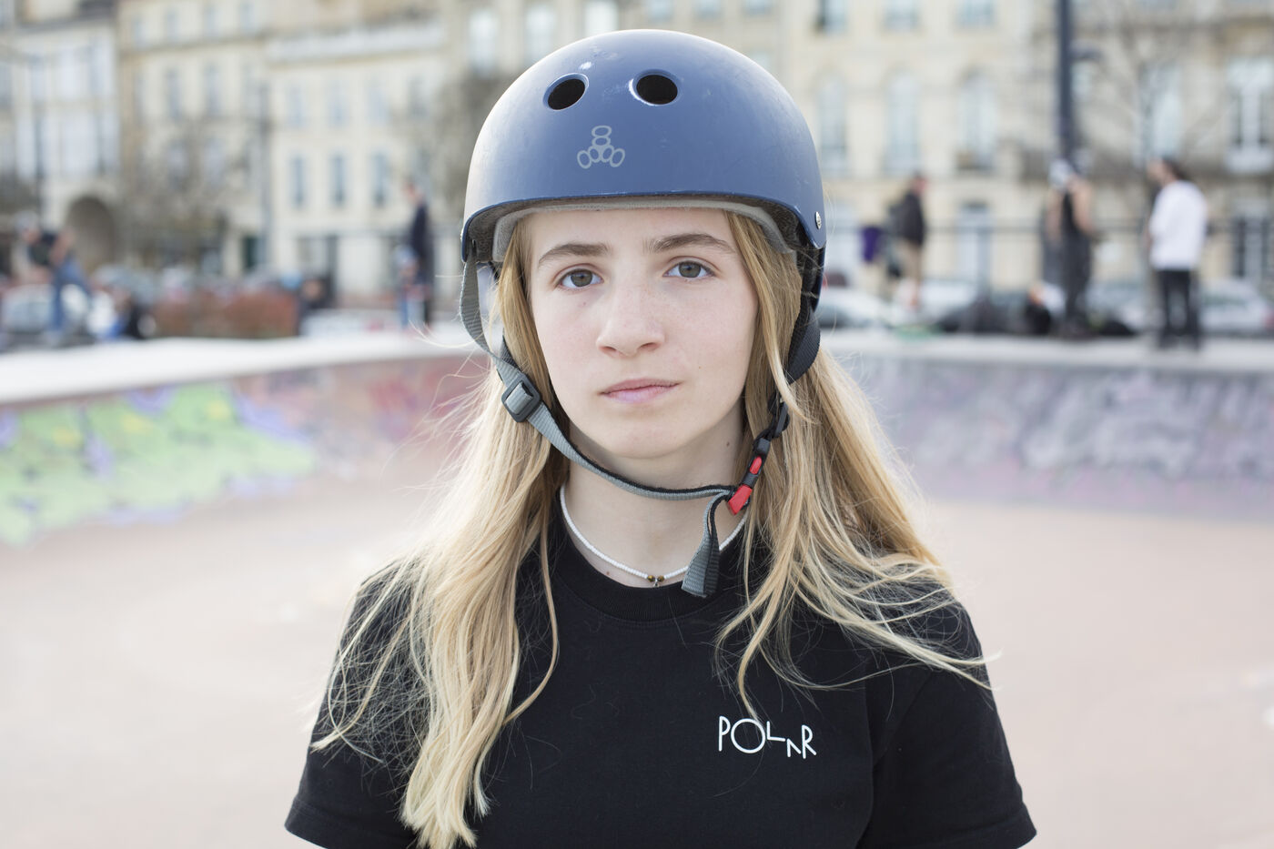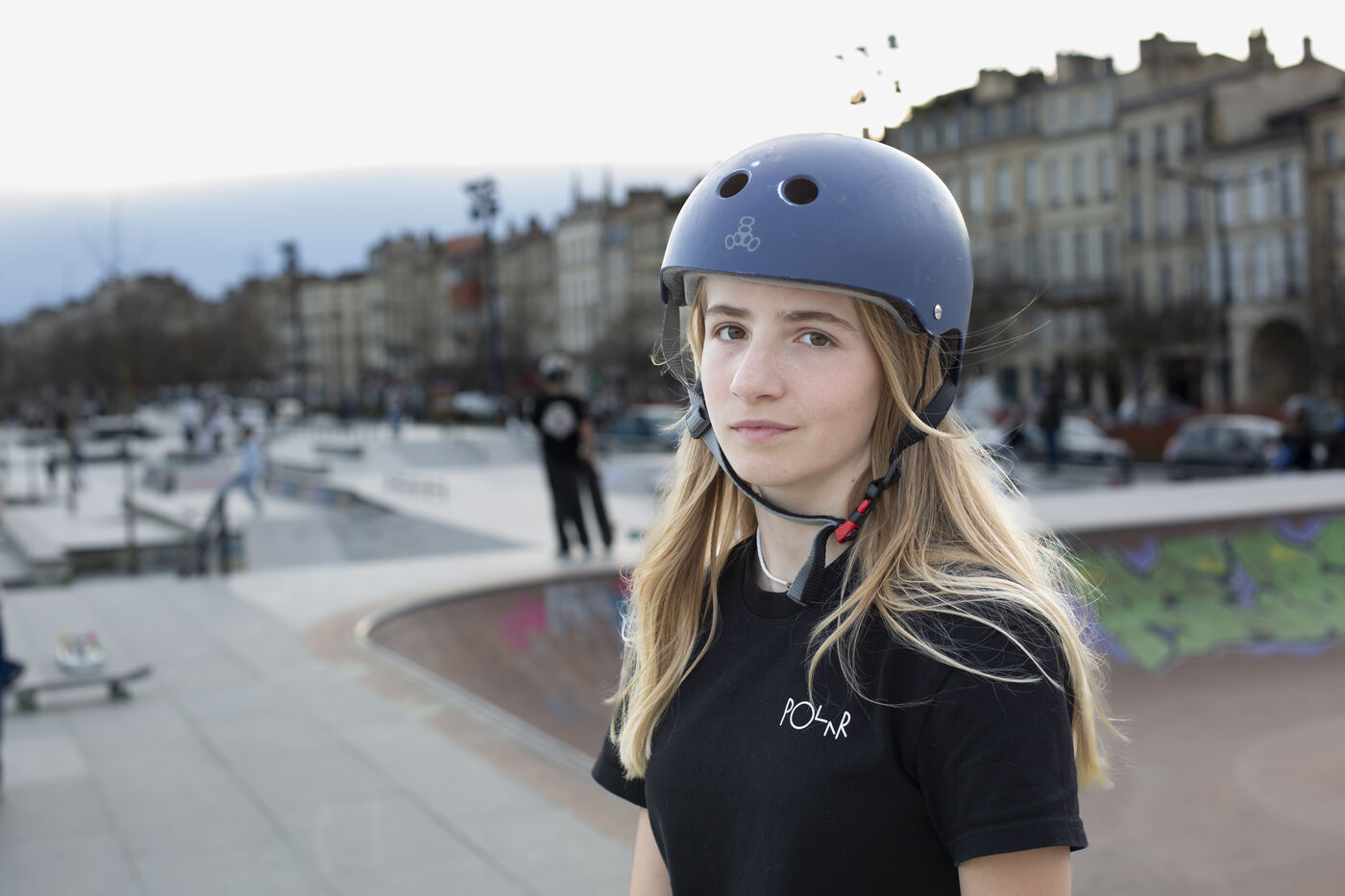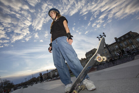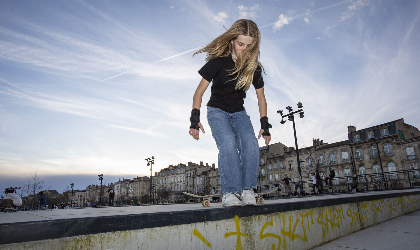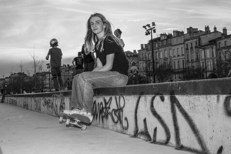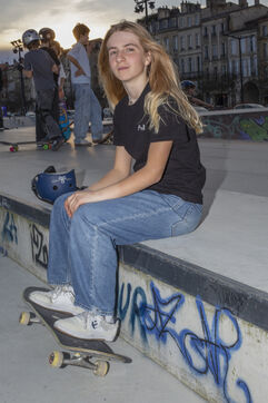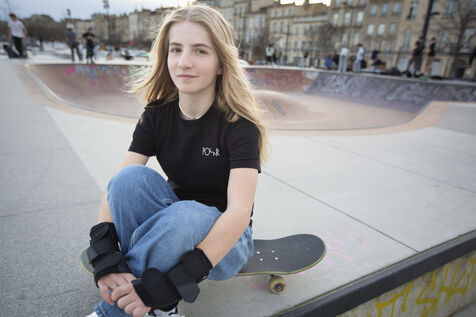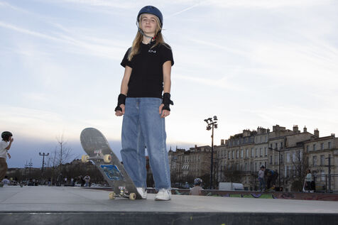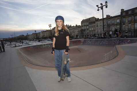 Portrait of Lucie Schoonheere at the Chartrons skatepark, Bordeaux. Lucie is 14 years old and is the French Under-16 Street Skateboard Champion for 2023.