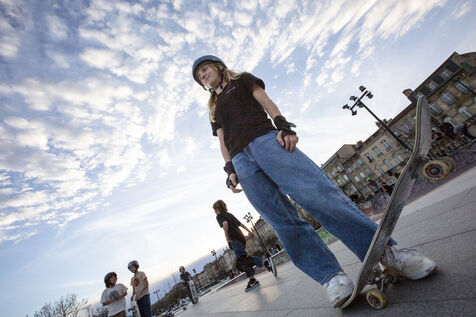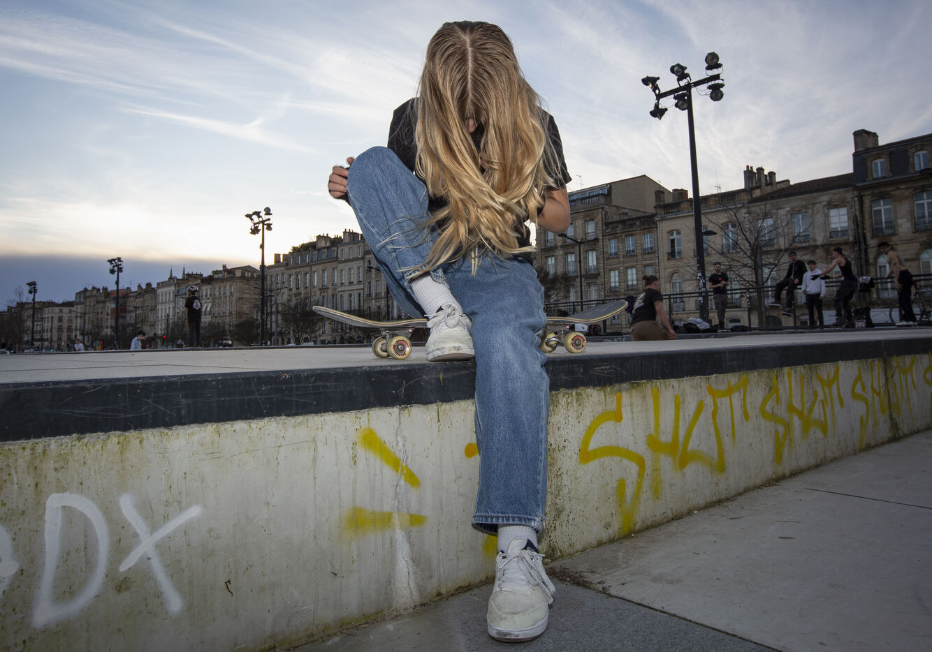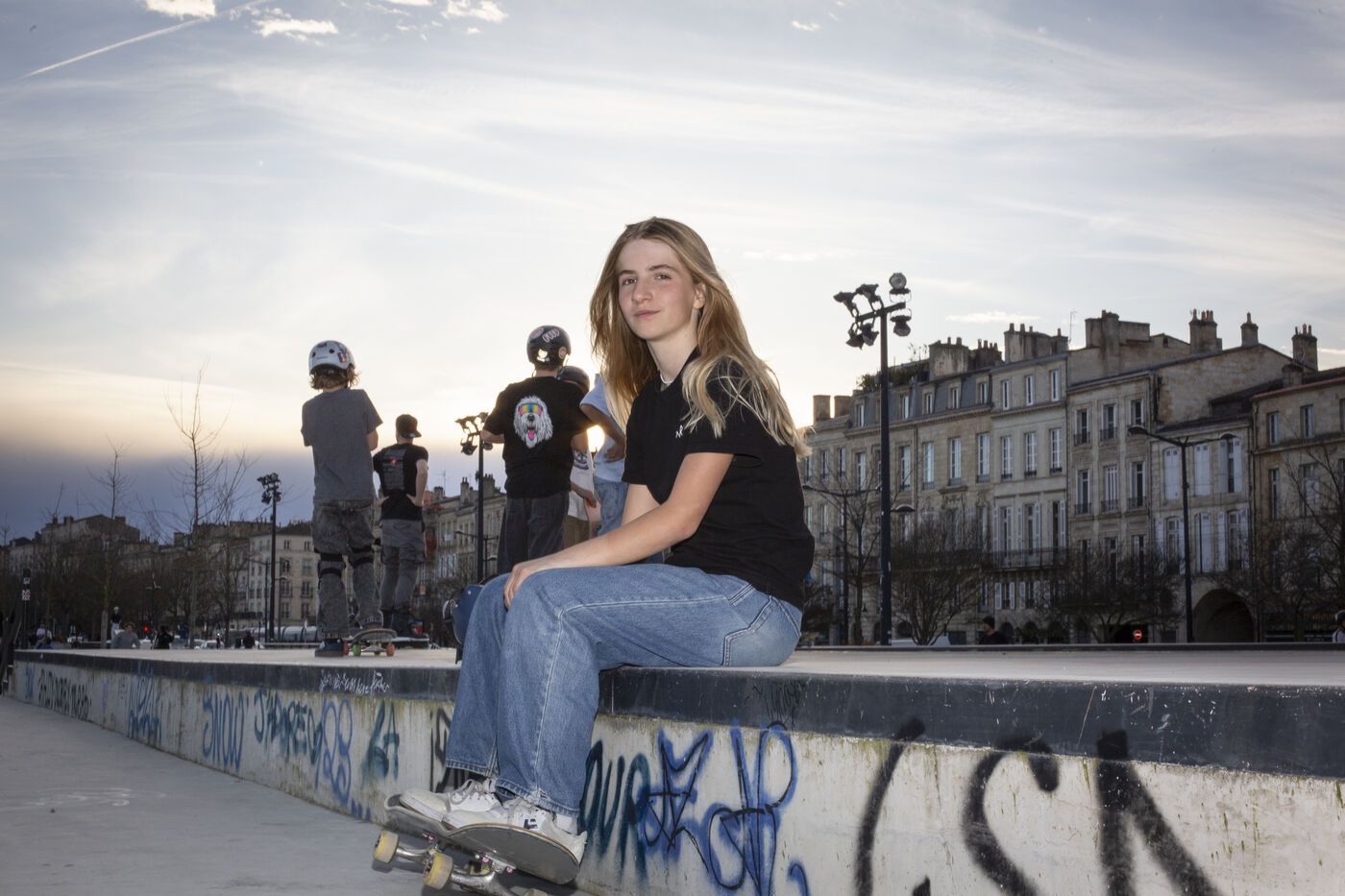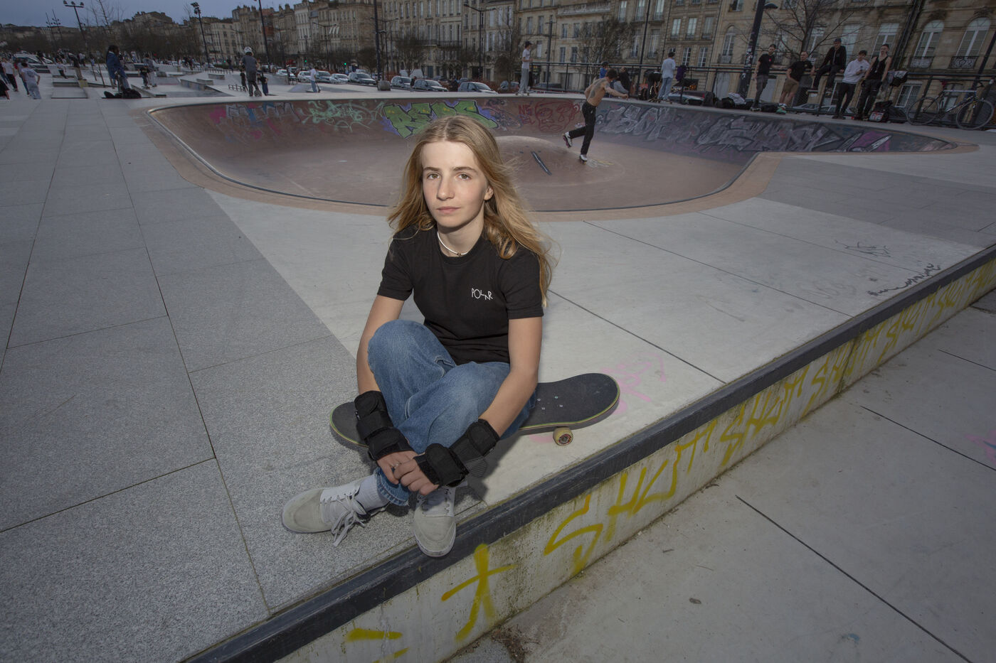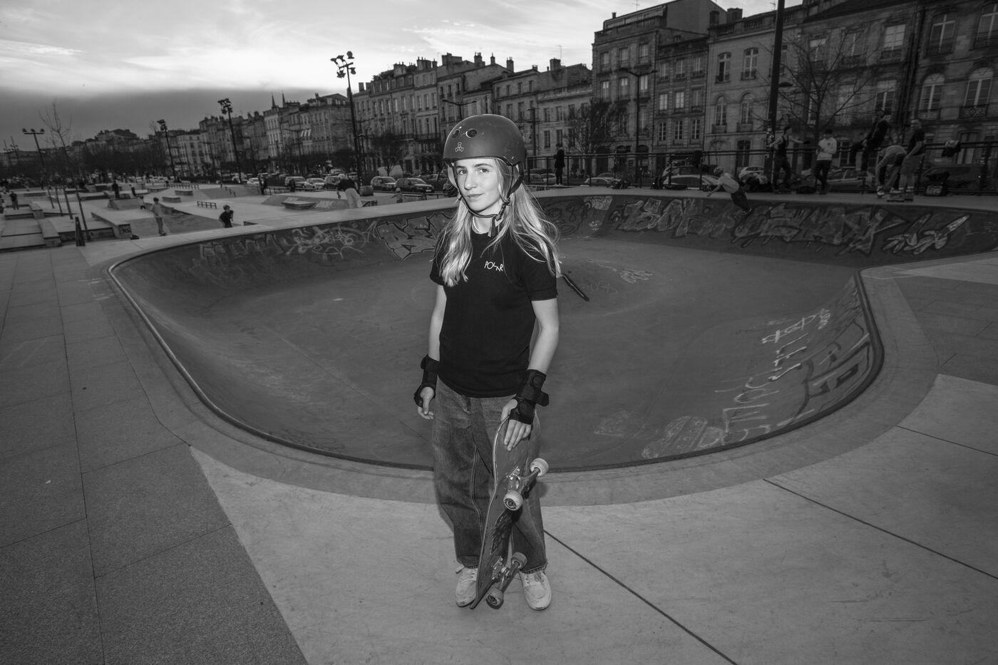 Portrait of Lucie Schoonheere at the Chartrons skatepark, Bordeaux. Lucie is 14 years old and is the French Under-16 Street Skateboard Champion for 2023.