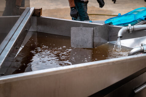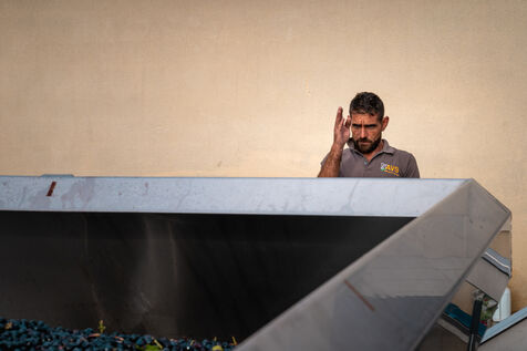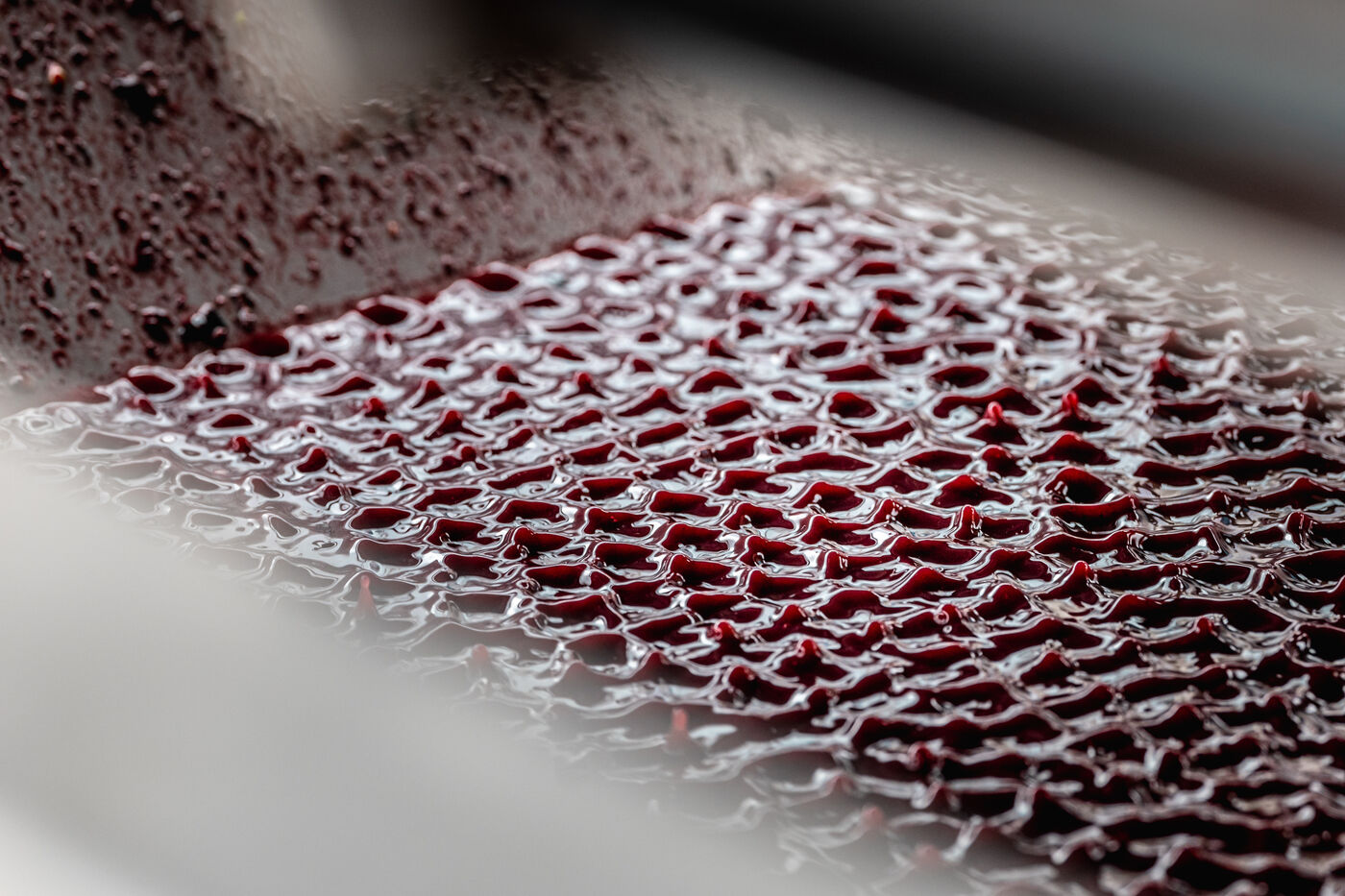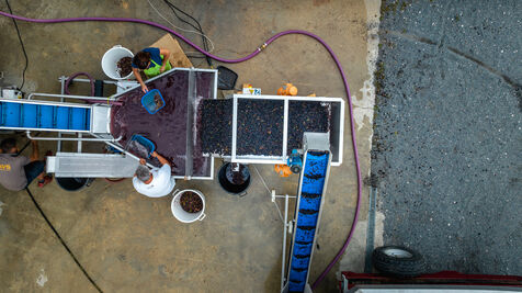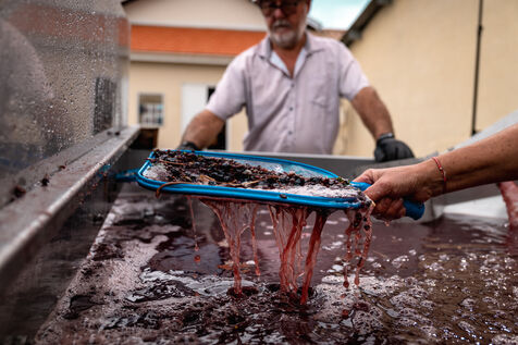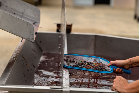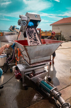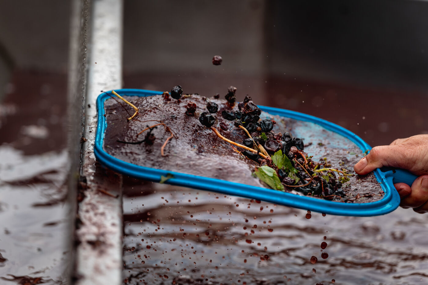 Journée de vendanges dans un château de l'appellation Blaye Côtes de Bordeaux avec tri des baies raisins par bain densimétrique par le procédé FLOTATRIE. Le tri par densité permet de faire couler les bonnes baies à vinifier et de laisser à la surface les raisins touchés par le milidiou ou le ver de grappe.