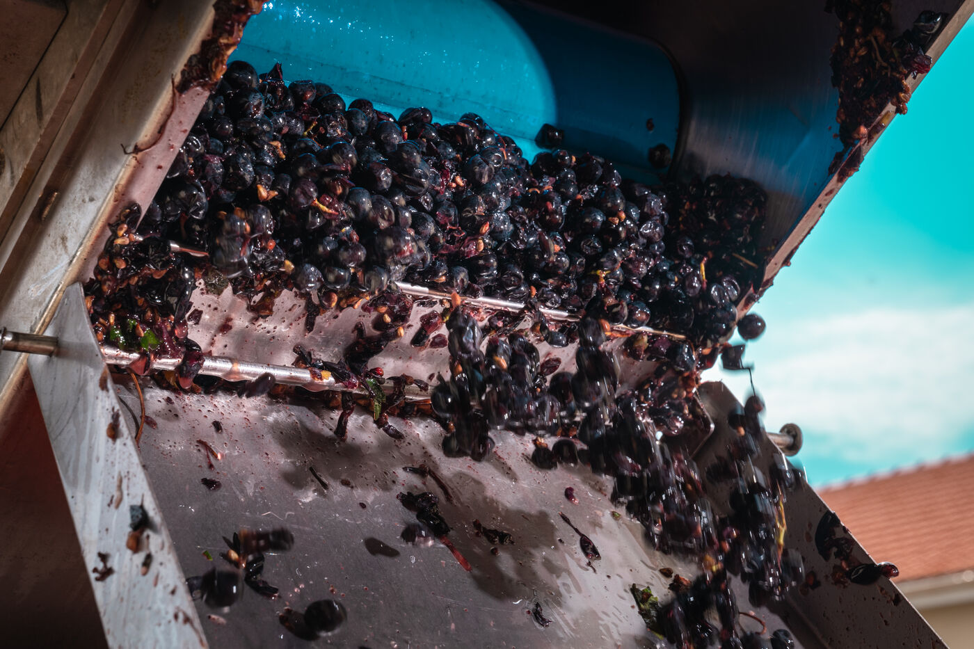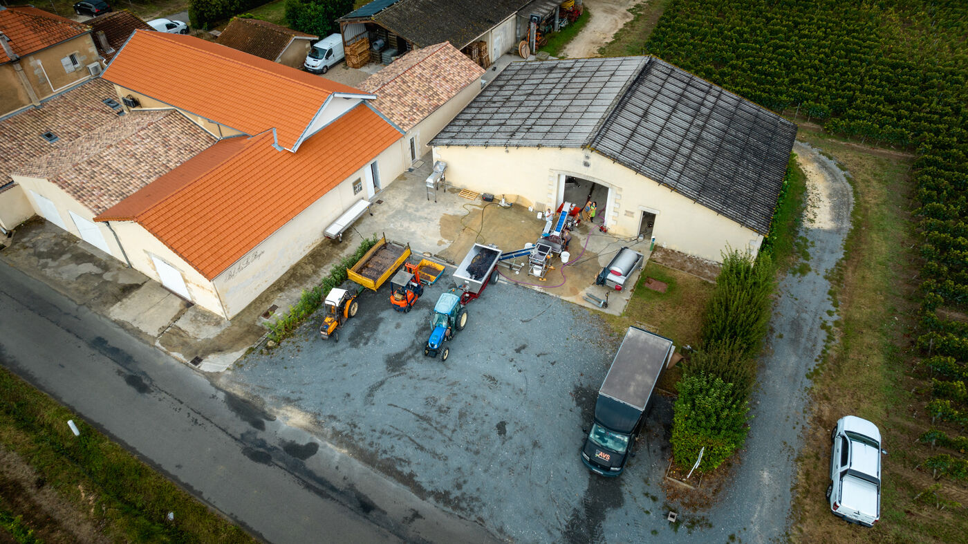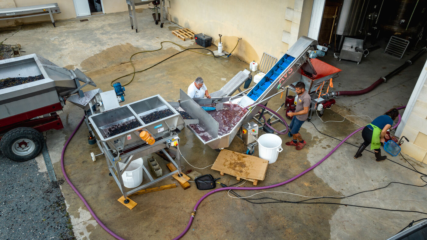 Day-long harvest at a château in the Blaye Côtes de Bordeaux appellation, with grapes sorted by densimetric bath using the FLOTATRIE process. Density sorting allows the right berries to flow into the wine, leaving grapes affected by mildew or bunchworm at the surface.