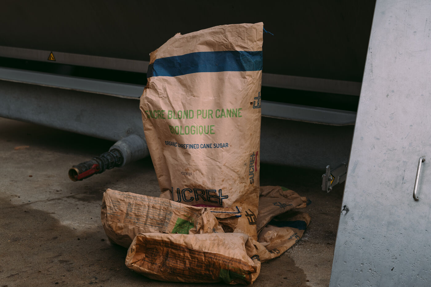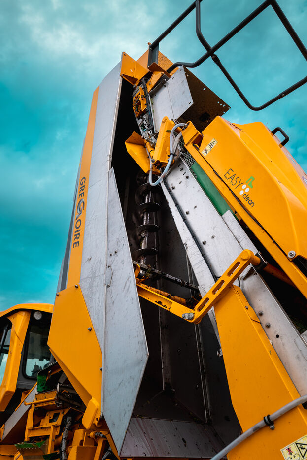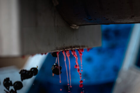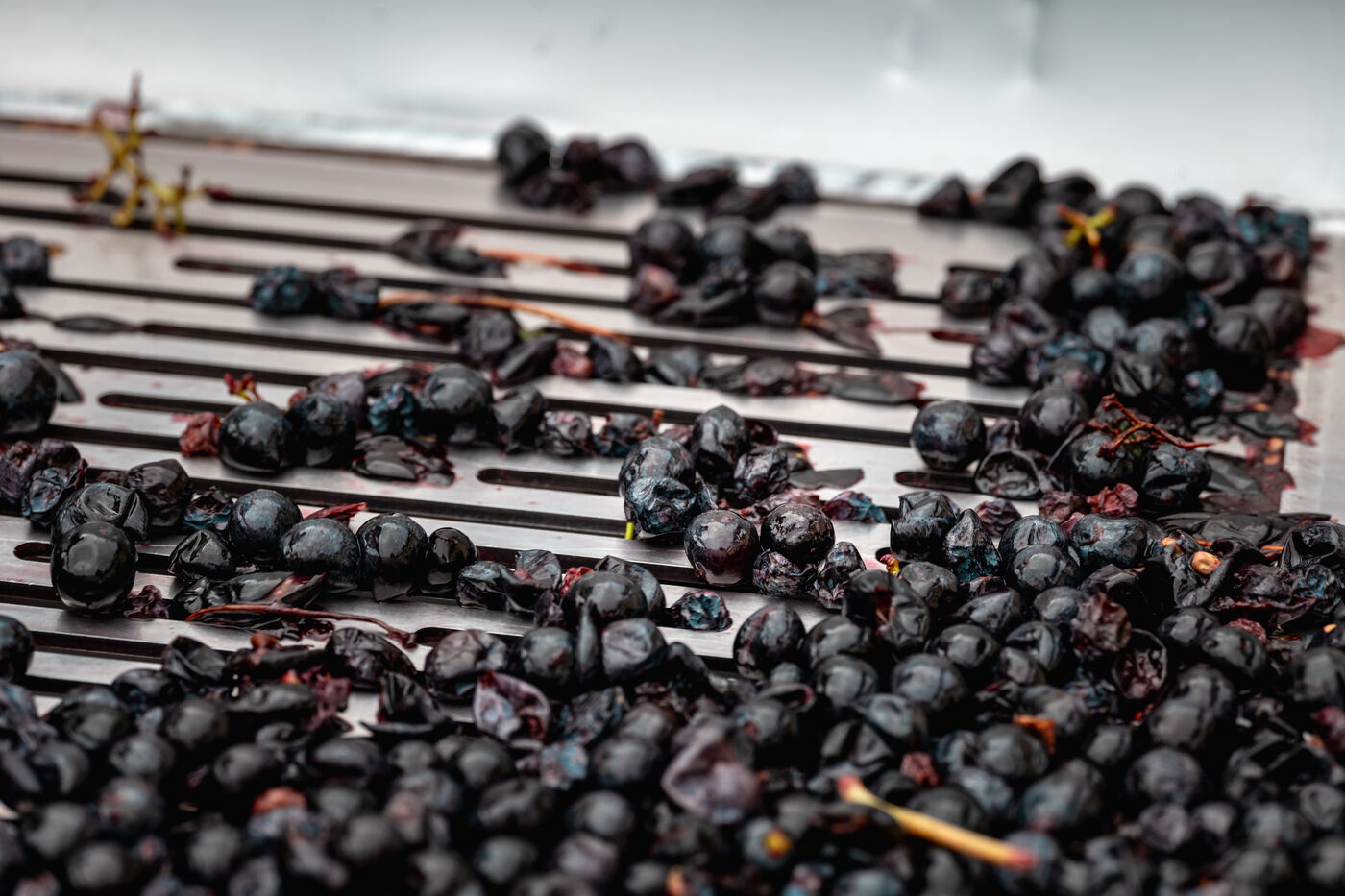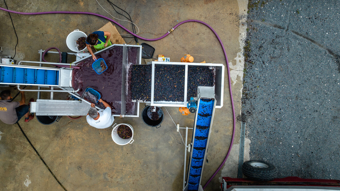 Day-long harvest at a château in the Blaye Côtes de Bordeaux appellation, with grapes sorted by densimetric bath using the FLOTATRIE process. Density sorting allows the right berries to flow into the wine, leaving grapes affected by mildew or bunchworm at the surface.