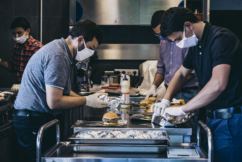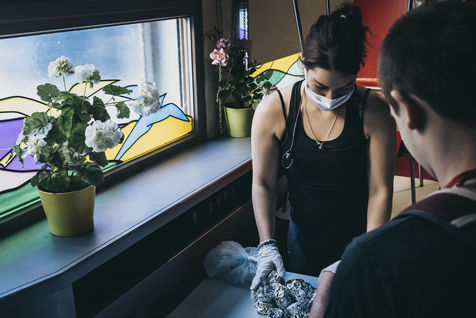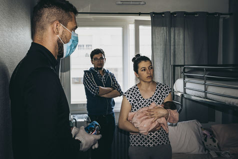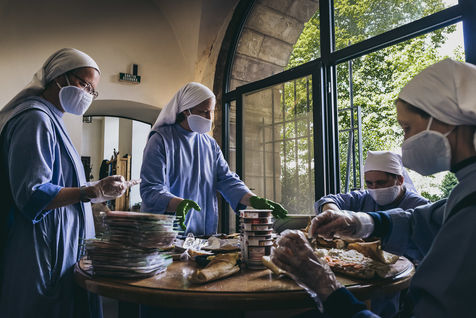 Arrivent Raphaël et Julien sur leurs vélos, chargés de bouteilles d'eau minérale récupérées dans un supermarché de la ville. Puis des frères séminaristes viennent livrer 60 repas qu'ils ont préparés dans l'après-midi. Petit à petit, d'autres personnes se présentent, leurs sacs pleins de repas, cuisinés par des particuliers ou des restaurateurs, de masques cousus le jour même, de gants, de barquettes en aluminum... Il y a là Marie, Gwennaelle, Sonia, Pablo, Isabelle et d'autres encore. La petite dizaine de bénévoles se retrouve dans la salle à manger de l'établissement pour trier et répartir un total de plus de 160 repas.