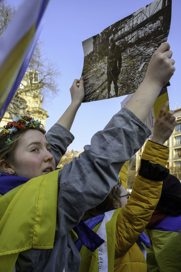 On the initiative of the PromoUkraïna NGO, several hundred people gathered to denounce Russia's war in Ukraine and to call on Europe and the NATO to ensure a no-fly zone.