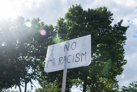 May 09 2020, Paris, France. At the time George Floyd was buried in Houston, nearly 2,400 people gathered in the quiet Place de la République in Paris. The crowd gathered at the call of SOS Racism observed 8 minutes and 46 seconds of silence, kneeling on the ground, in reference to the length of time Derek Chauvin held his knee on George Floyd s neck.