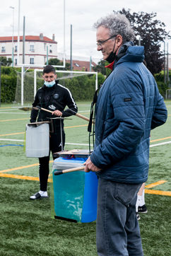 At the Geo Andre stadium in La Courneuve, the first of the 4 music workshops, "tambours battants", the musical comedy of Flash, the american soccer team of La Courneuve, was held today. As part of the preparation of the Cultural Olympics of 2024, the Flash and the associations Lutherie Urbaine 9.3 and the Opera de Bouche à Oreille are joining forces to build a musical "East Side Stories". Photograph by Constance Decorde / Hans Lucas