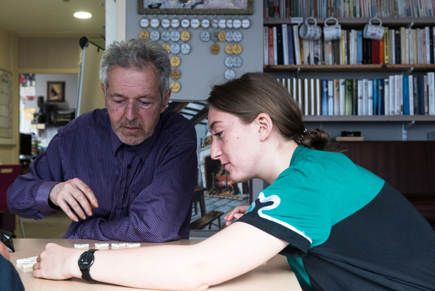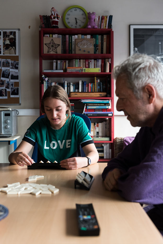 06/06/2021, Paris, France. A volunteer at the Petits Freres des Pauvres, at the Anne-Marie Blaise structure which welcomes 14 residents over 50 years old with limited resources. She spends 2 hours a week with the residents. They play board games and chat.