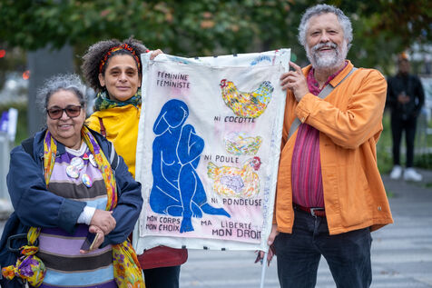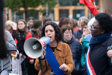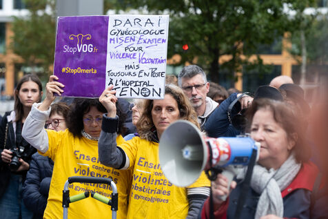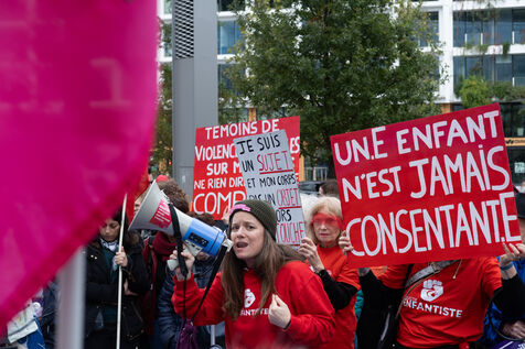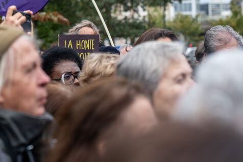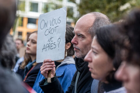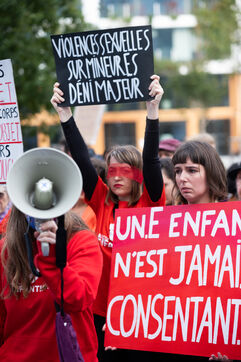 Rally in front of the courthouse of Paris in support of victims of sexual violence. Demonstrators highlight current events such as the trial of the Mazan rapists, revelations about Abbe Pierre, rape and murder of Philippine, to demand a comprehensive framework law against sexual violence and financial resources to combat it.