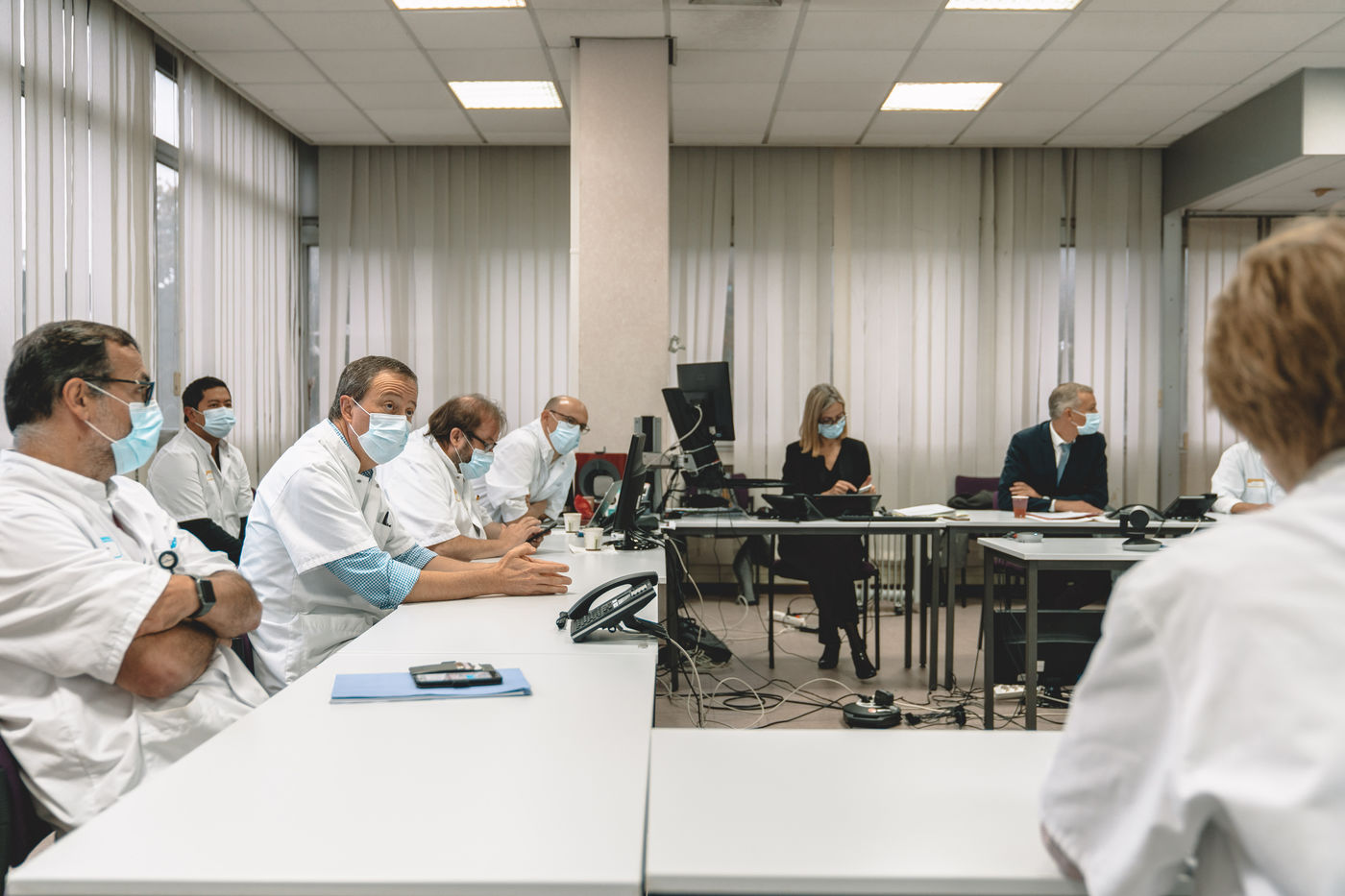 Au sein de la cellule de crise du centre hospitalier universitaire CHU de Bordeaux Pellegrin qui gère l'évolution de la pandémie de covid 19 de la région Nouvelle-Aquitaine. Bordeaux, 13. Octobre 2020.