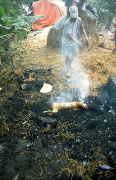 The dog is a breeding dog. But there are no large slaughterhouses or distribution centres as such. Everything is done upstream in the villages. From the 2nd fortnight of the month, every day, dog preparers and sellers go around the villages looking for available dogs, addressing all the inhabitants. Generally, the "harvest" is low at the beginning of the period (1 to 5 dogs / day) and intensifies at the end of the month (25 to 30 dogs / day); dog meat lovers rush at the last minute to eat.