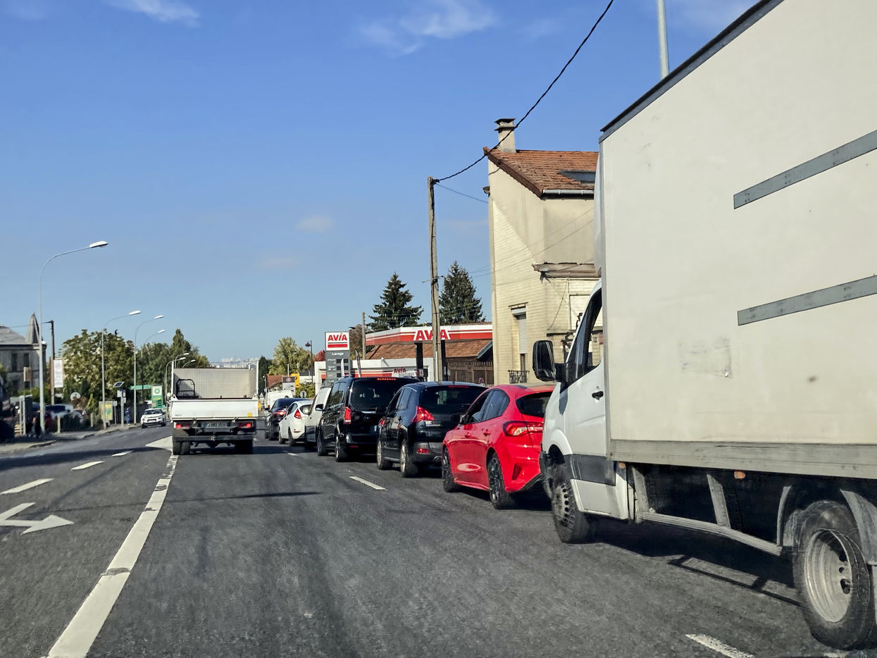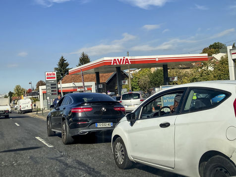 France. Boissy Saint Léger. 2022-10-11. File d'attente aux stations service suite a la penurie de carburant. La greve des salaries de TotalEnergies bloque les raffineries. Pour faire face à la pénurie d essence qui touche la capitale, les automobiliste s arment de patience aux stations service encore pourvues de carburant. Parfois, il faut se rendre en banlieue pour se ravitailler. 30,8 % des stations-service de France manquent d'au moins un carburant, selon le ministere de la Transition energétique. Les Hauts-de-France et l'Ile-de-France restent les régions les plus touchées. Photographie par Chau Cuong Le / Hans Lucas.