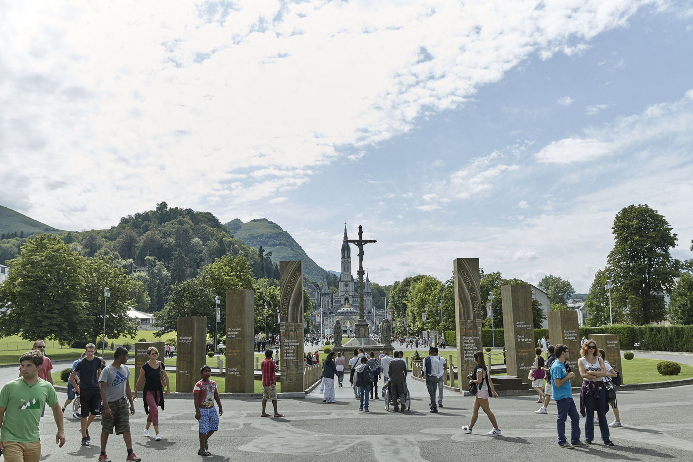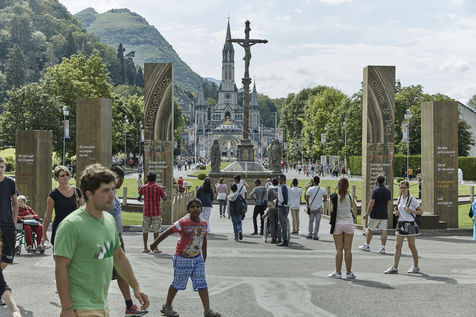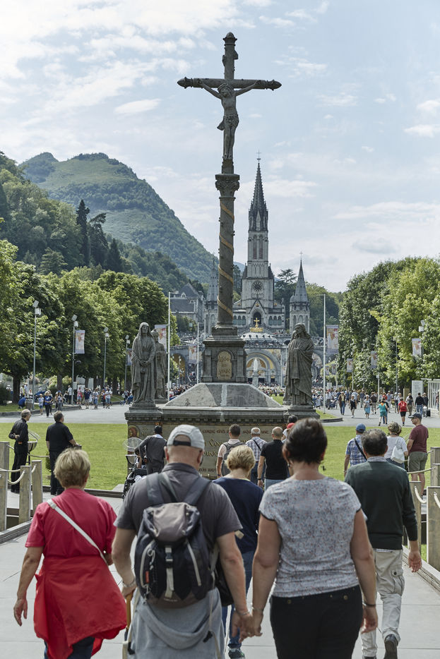 Lourdes, a place of catholic pilgrimage. Reporting. Since the apparitions in 1858, Lourdes takes in and welcomes every year 6 millions of pilgrims or visitors from all around the world. 60 000 sick or invalid people are among this pilgrims. Lourdes is the third place of catholic pilgrimage after Vatican and the Basilica Notre-Dame of Guadalupe in Mexico. At the approach of the feast of the Assumption, the arrival of the pilgrims become intensified. Lourdes, 9th august 2016.