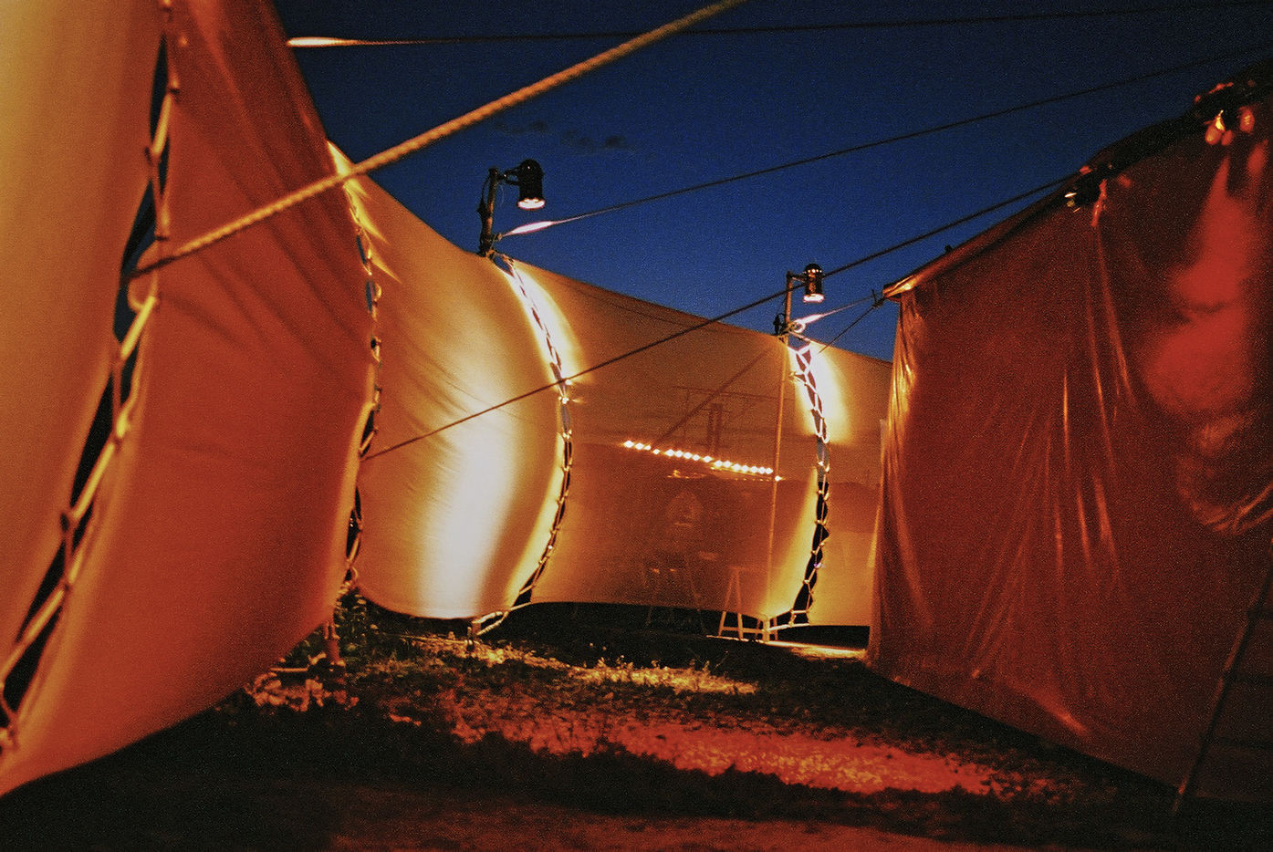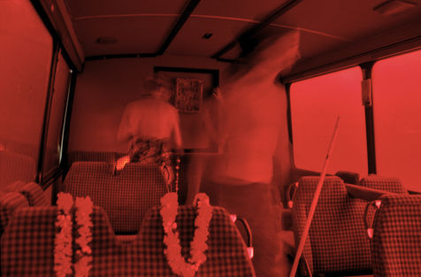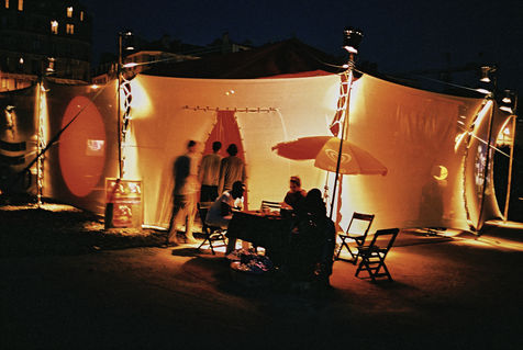 Last adjustments backstage befor the opening of the bus. The Caravanserai : A nomad bus in 3D experience. The bus shows different documentary movies about the trip, being on the road. The films were shooting in African or South America continents. The distinctive characteristic of this initiative (leading by the collective of artists Alternative Nomade) resides in its technical conception : firstaval, the film is shown by several projectors on mirrors put all around the bus. After which, the film is reflected in the windows of the bus. The spectators sitting on the bus have the impressions of being on the road, living a trip even when they are physically still, motionless. Images of life, dugout lap, plane landing. Deeply submerged by the experience, the spectator do lives this documentary movie in 3D. Around the bus is settled a kind of big top where we can have a rest in the moroccan area, drink tea, have a look to different photo exhibitions. Others films are also projected on the wall of the big top. Paris and Avignon (2004, update 2016)