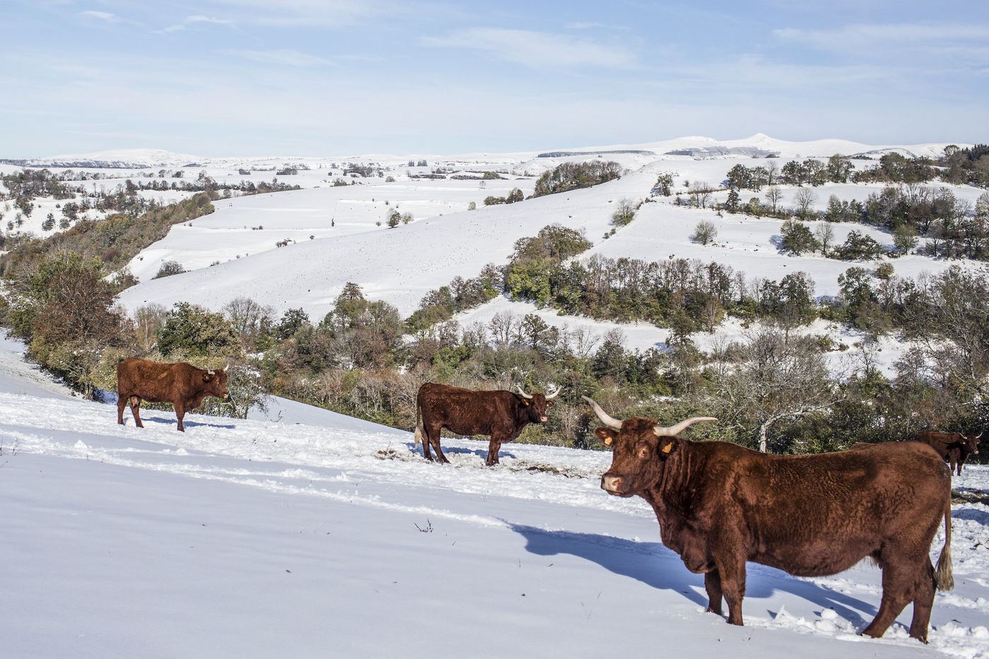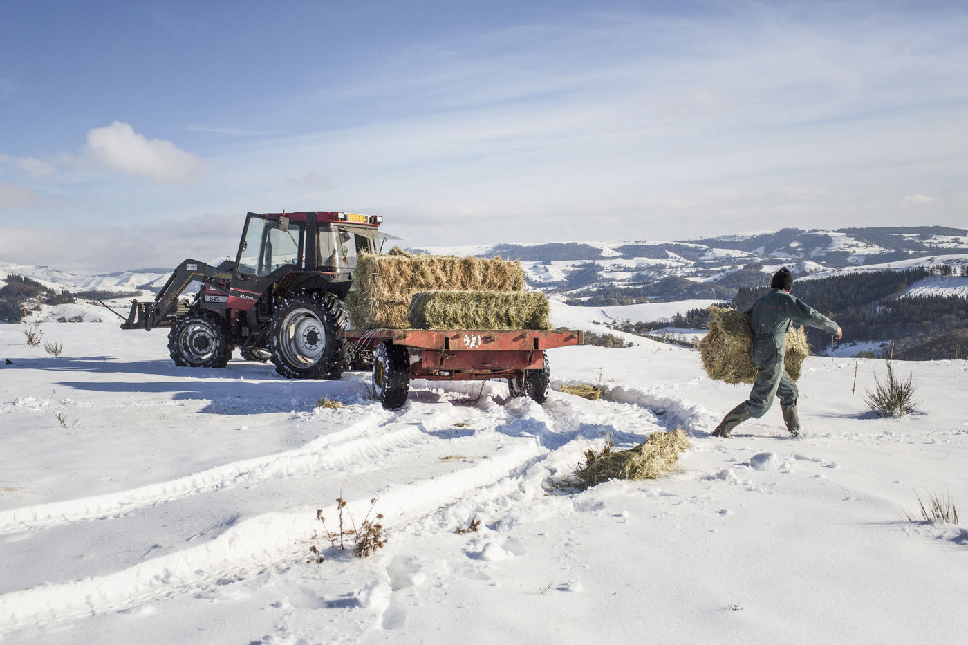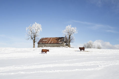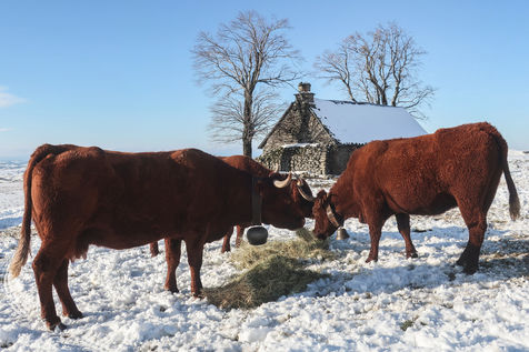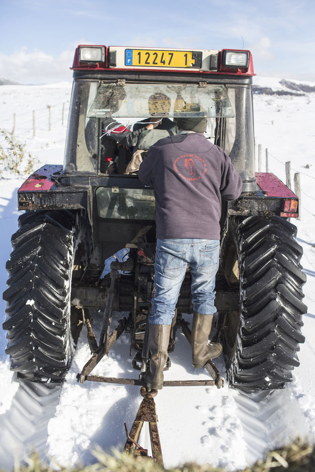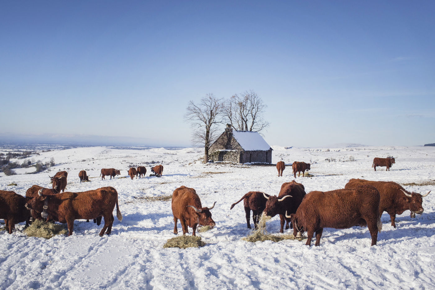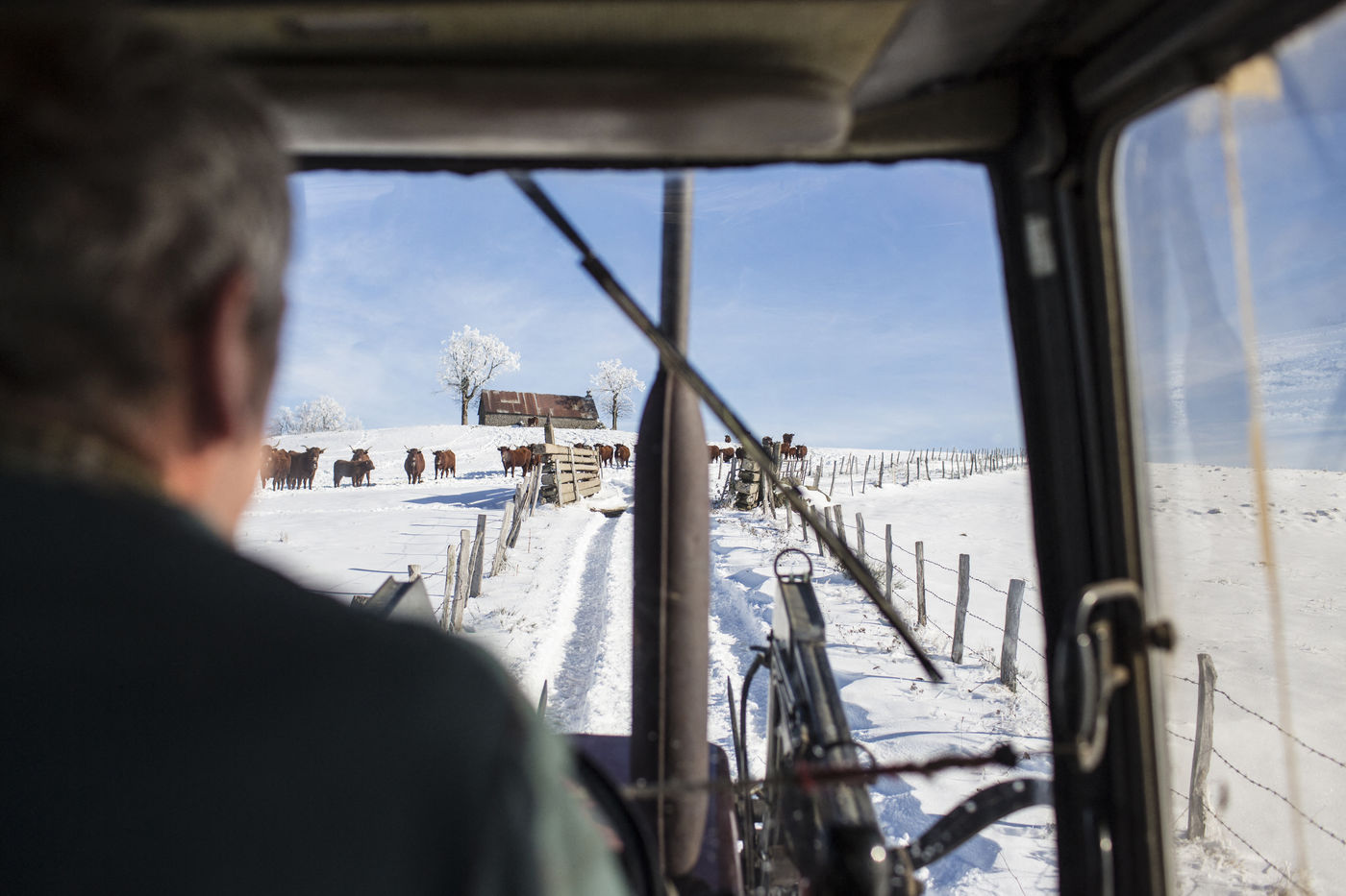 La neige est tombée plus tôt cette année sur le Massif central. Soucieux du bien-être de ses bêtes, Georges, éleveur de Salers à Tournemire dans le Cantal, est monté sur les hauteurs, là où la déneigeuse ne va pas, porter un peu de fourrage à ses vaches.