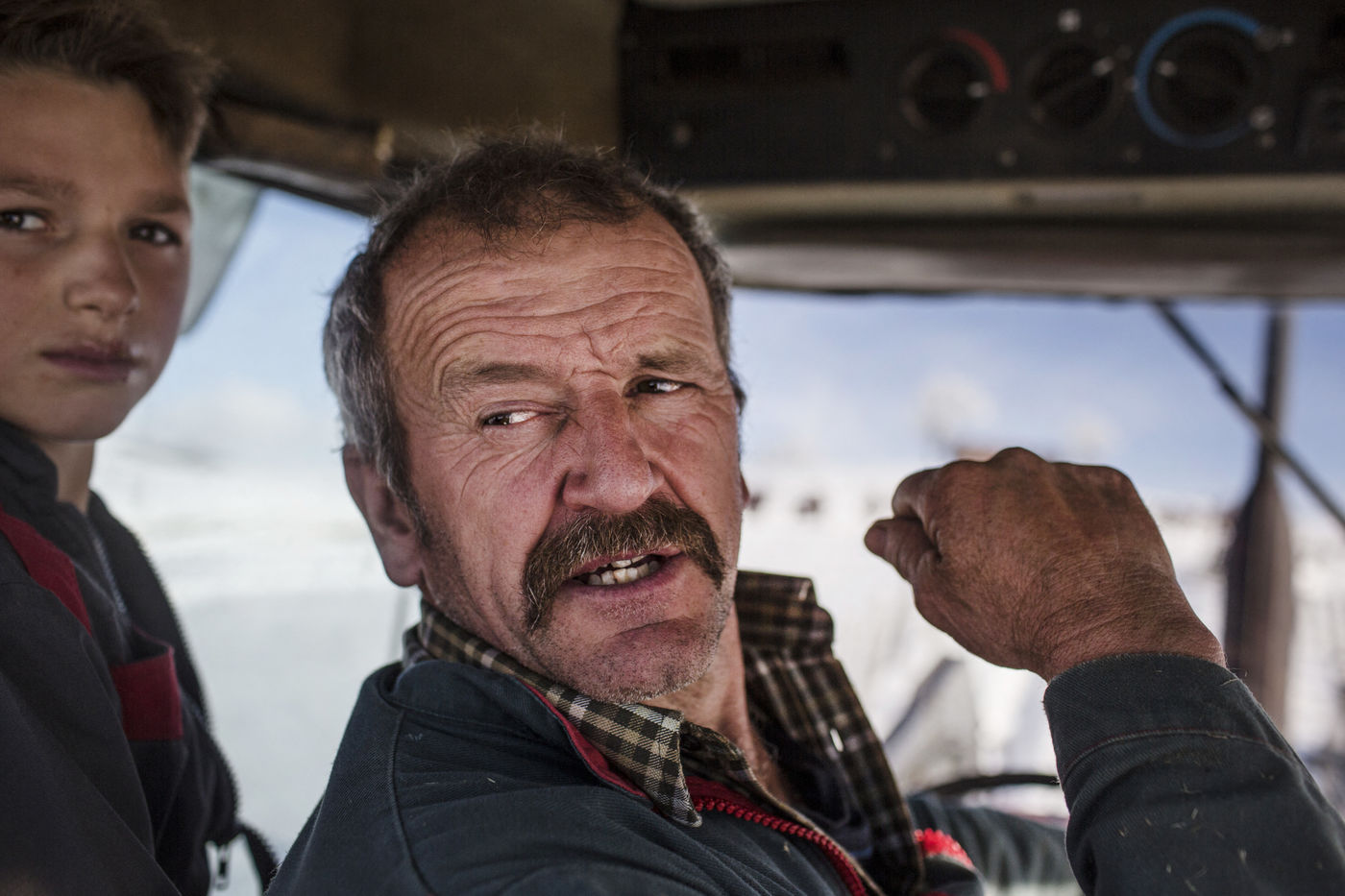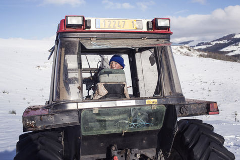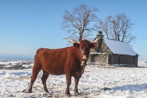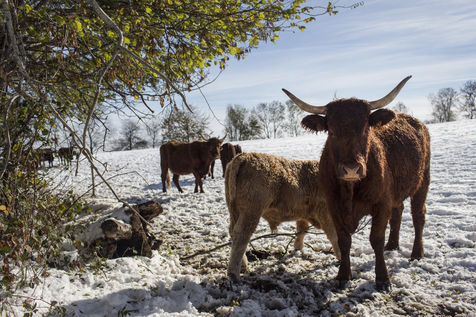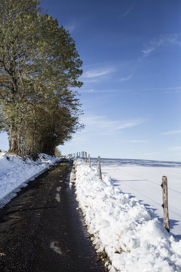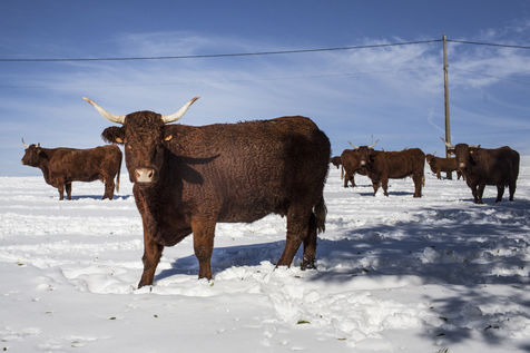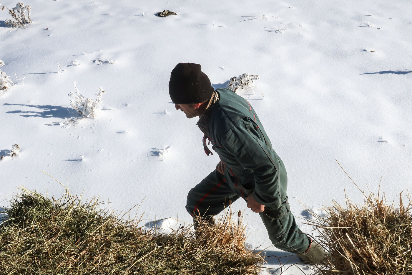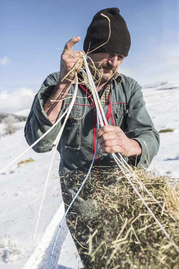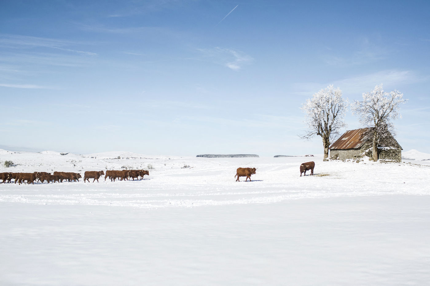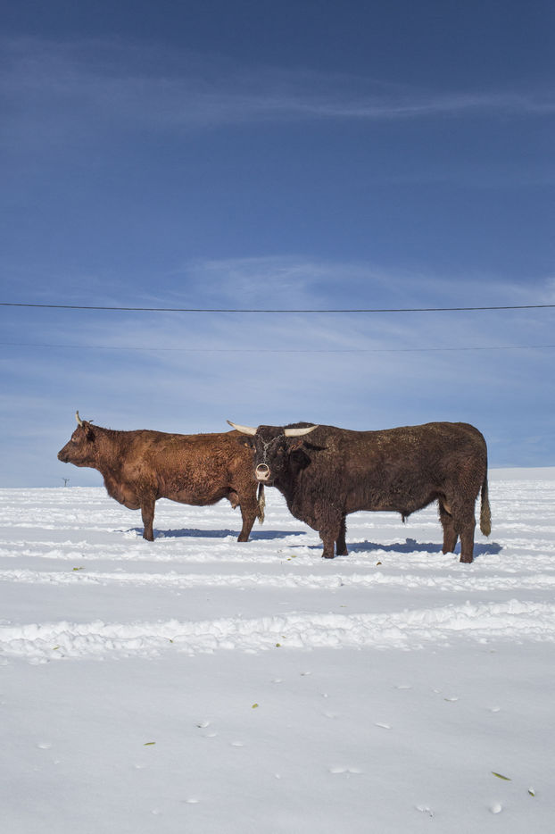 La neige est tombée plus tôt cette année sur le Massif central. Soucieux du bien-être de ses bêtes, Georges, éleveur de Salers à Tournemire dans le Cantal, est monté sur les hauteurs, là où la déneigeuse ne va pas, porter un peu de fourrage à ses vaches.