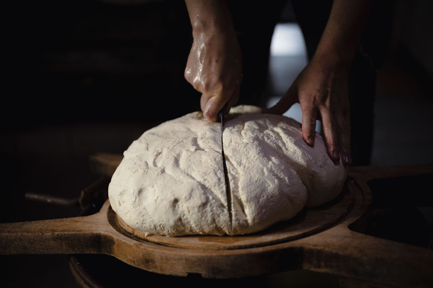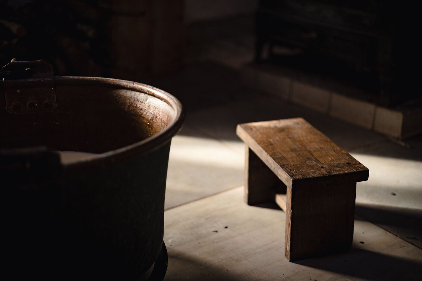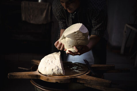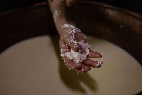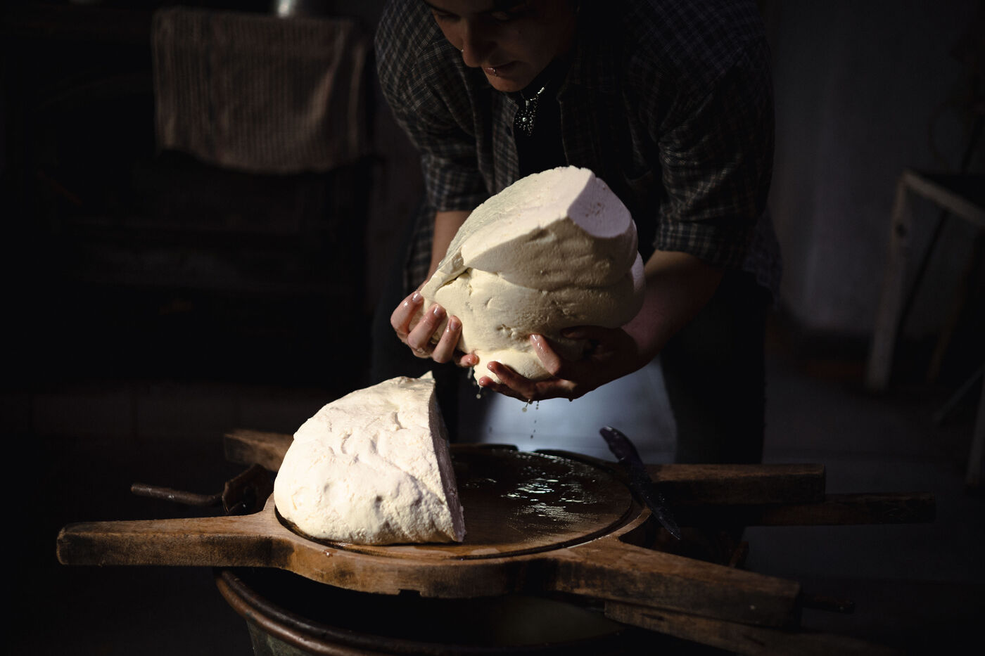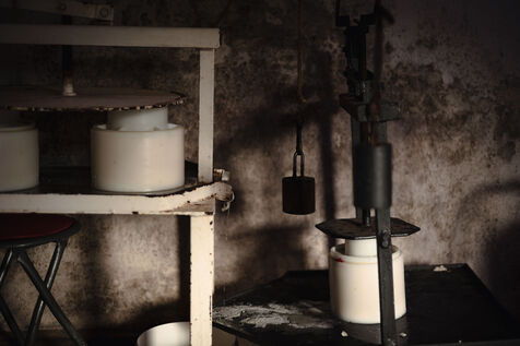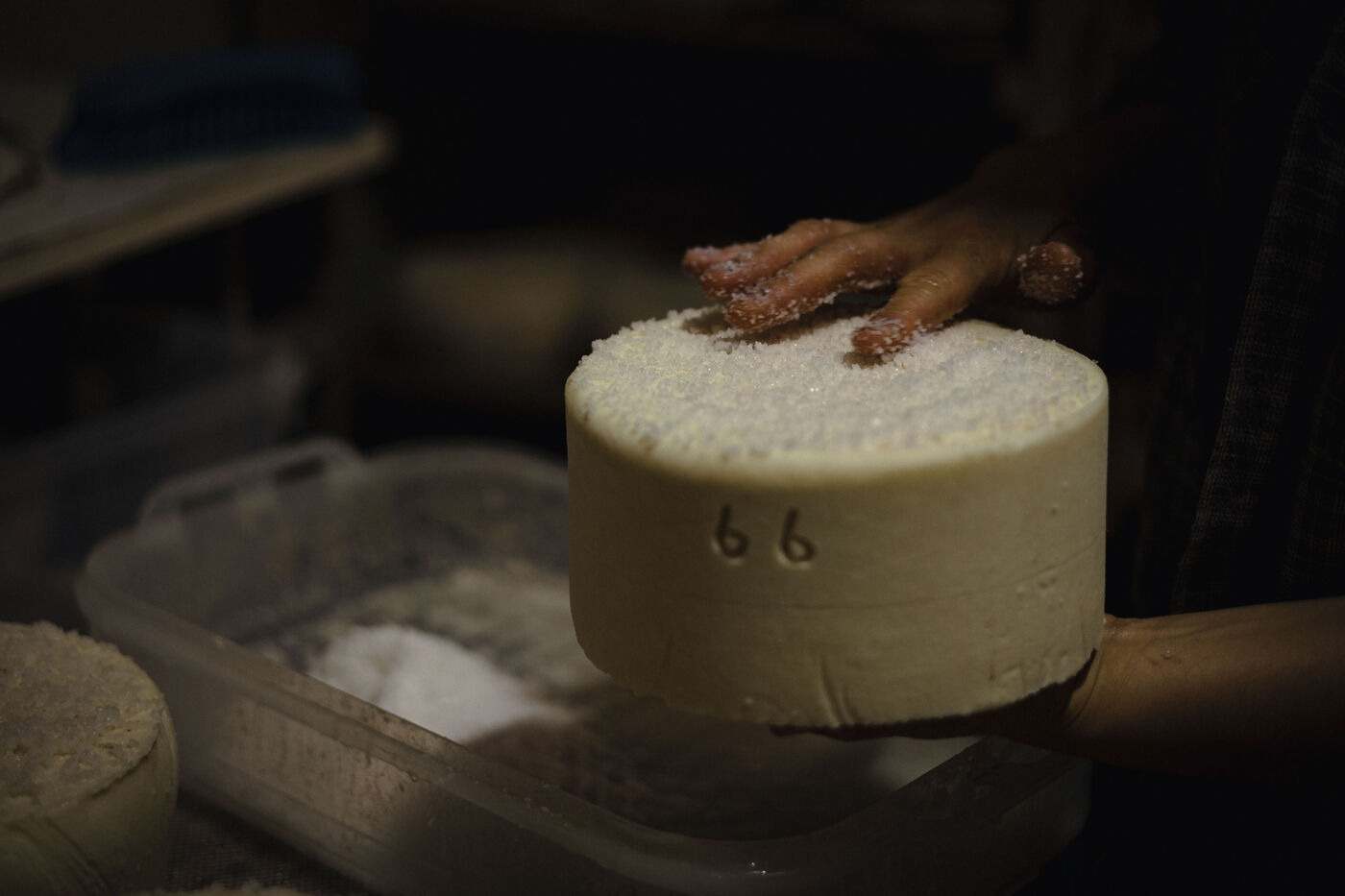 Claire then pours it into the copper cauldron that she places on a gas stove that she lights. There, she slightly increases the temperature and then she rennets it to make it curdle. A few minutes later, it is necessary to mix everything to break the curd into small grains which ends up agglomerating into a large firm ball. This ball is then cut to the size of the molds in which it will be distributed. These molds are then placed under a press until the evening or the next day, then salted and placed in the cellar where the refining will begin.