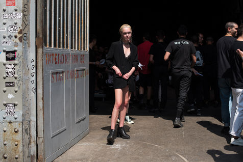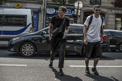 Y/Project, the rising Parisian brand, is doing its show at La Générale on June 21, 2017, during the men's fashion week. Crowd bath with fans under an intense heat wave. The young men paraded inside La Générale and went out onto the sidewalk, passing from the spotlights to the brightness of the biting sun. An unexpected moment to see the street take over the collection.