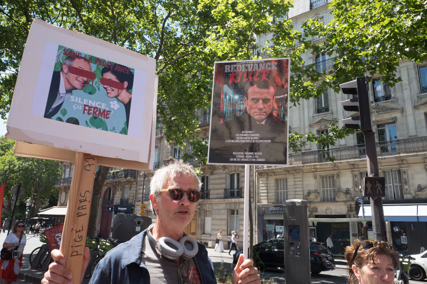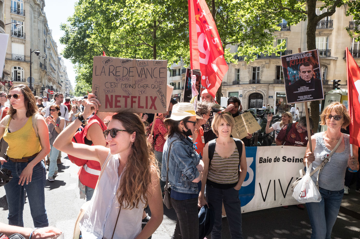 DEMONSTRATION CALLED BY ALL THE PUBLIC BROADCASTING UNIONS IN THE STREETS OF PARIS TO DENOUNCE THE ABOLITION OF THE TELEVISION TAX;