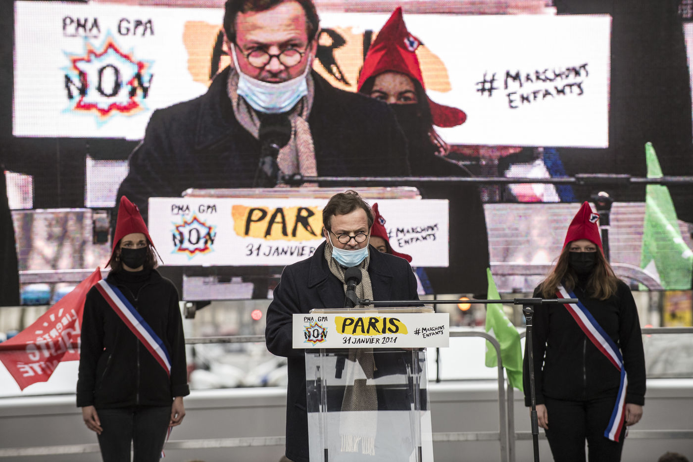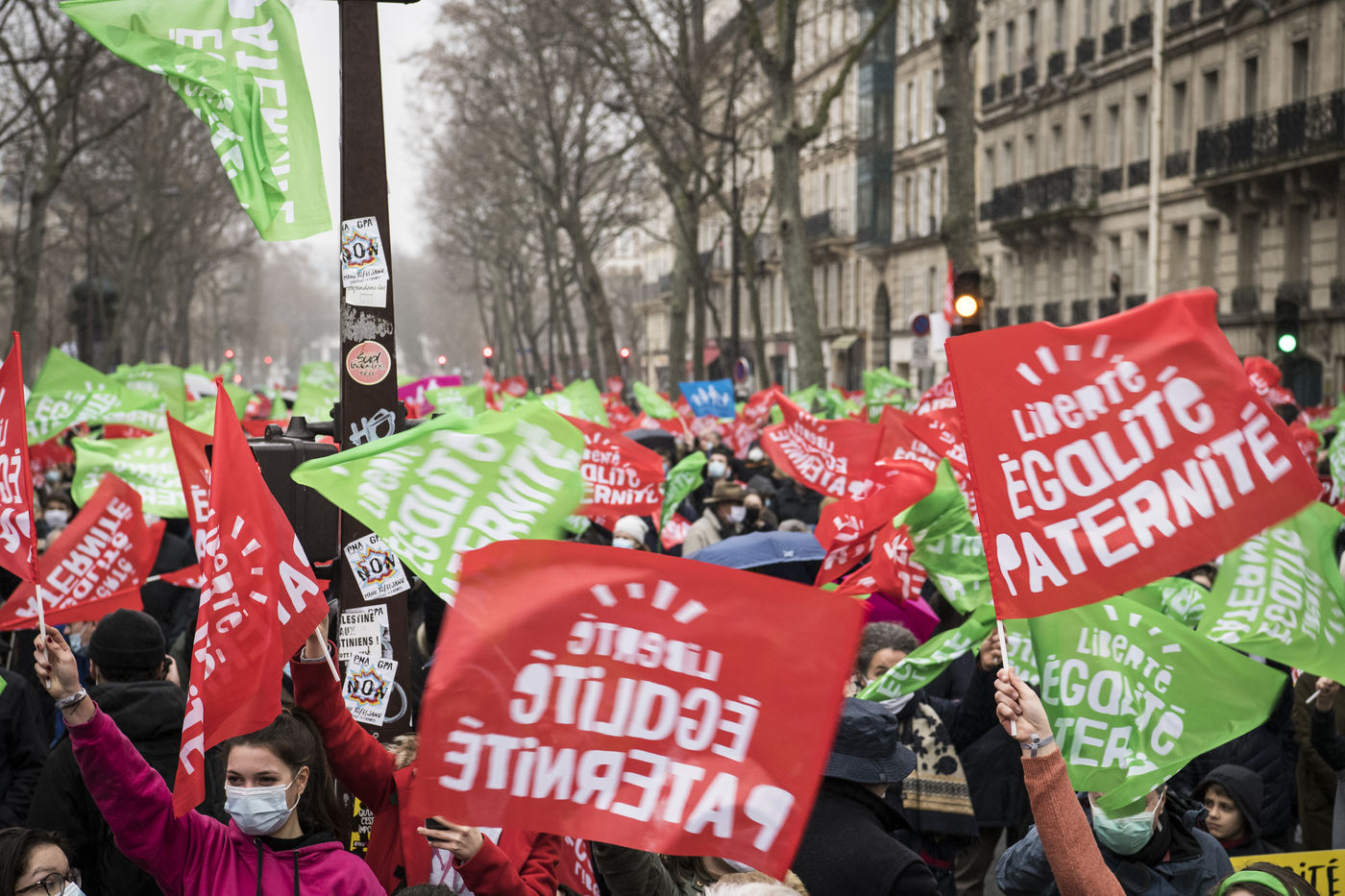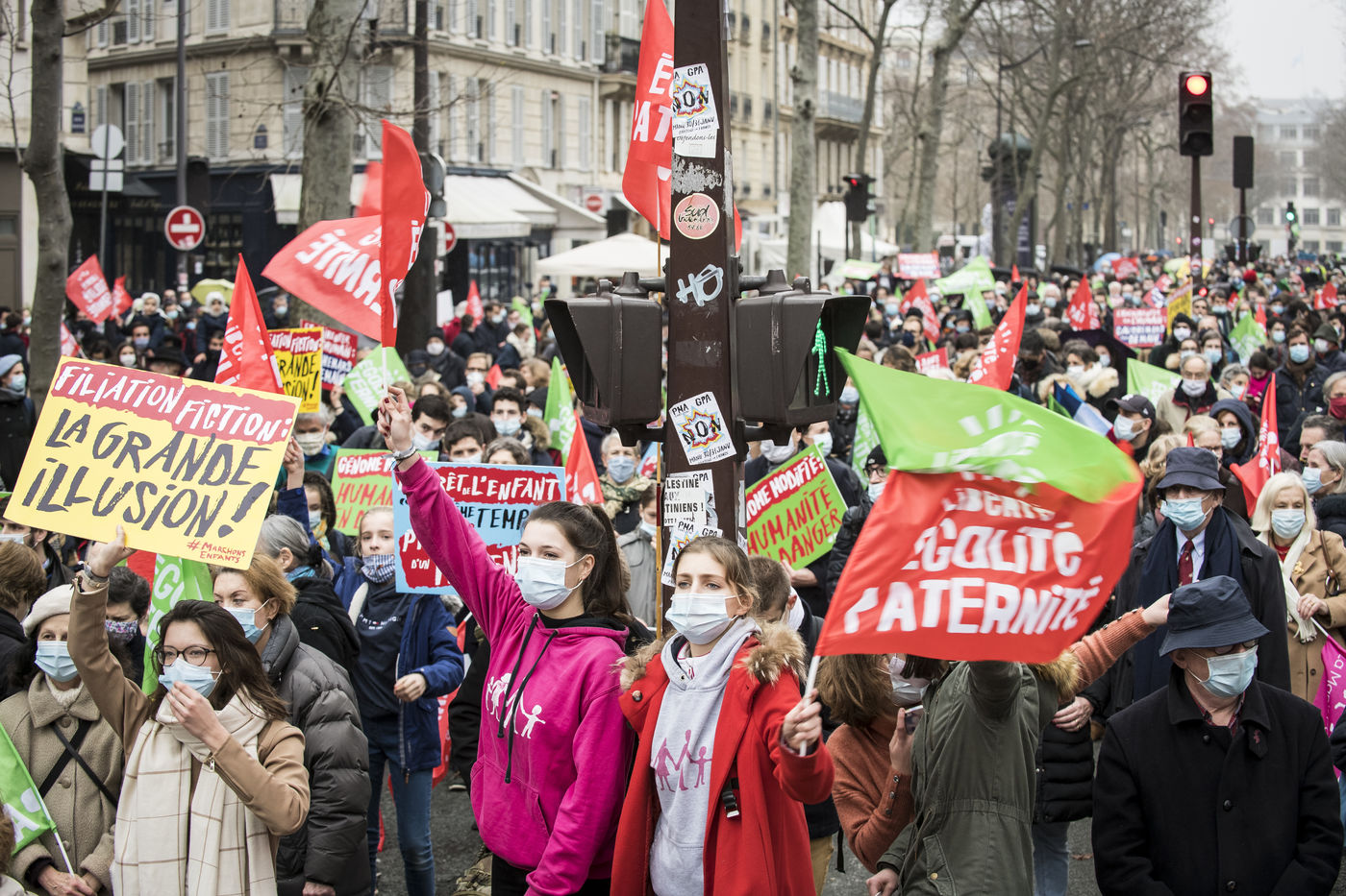 At the call of La Manif Pour Tous, several thousand demonstrators gathered against the bioethical law, the fatherless PMA (Procéation Médicalement Assistée) open to all and the GPA (Gestation Pour Autrui), in front of the Ministry of Solidarity and Health.