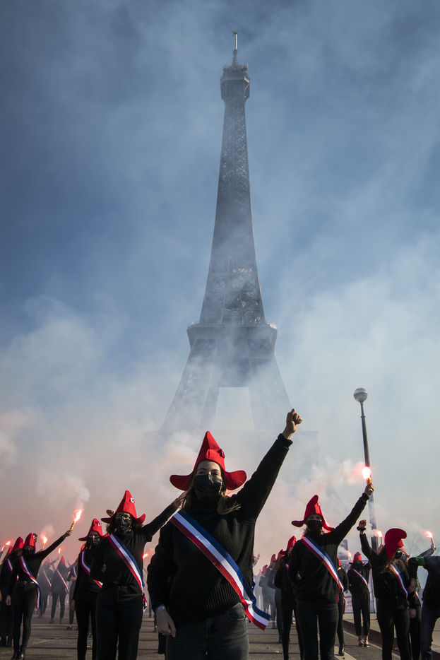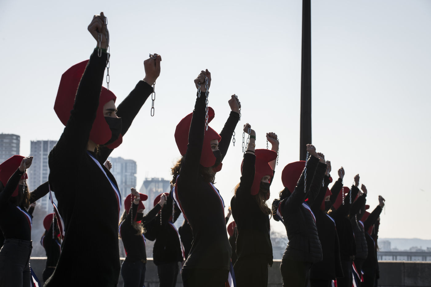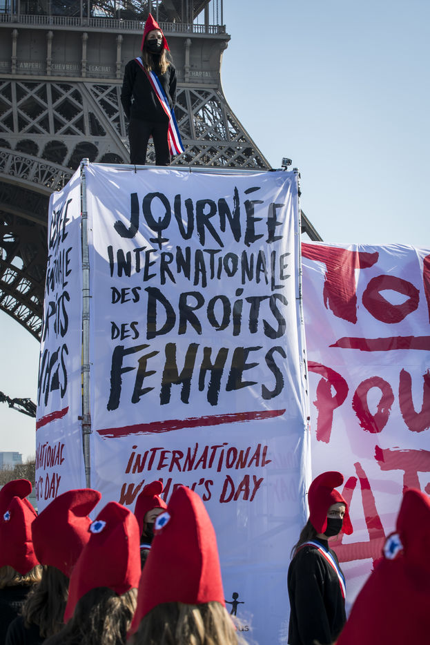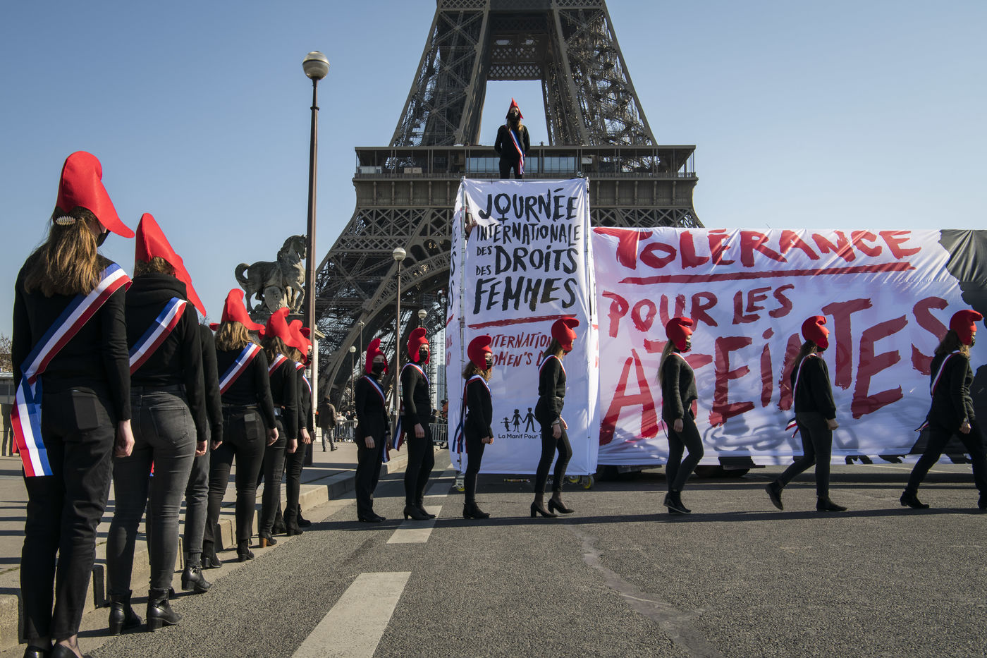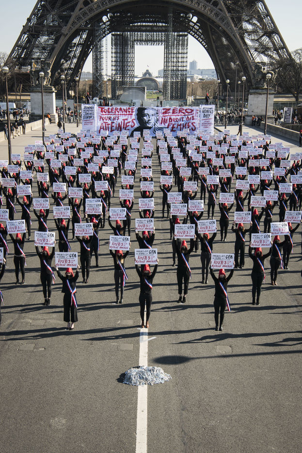 On the eve of International Women's Rights Day, the Manifesto Pour Tous mobilized against FGM and fatherless LDCs. Inviting the press 268 Mariannes participated in a scenography and questioned Emmanuel Macron against the attacks and threats to women's rights, at the foot of the Eiffel Tower.