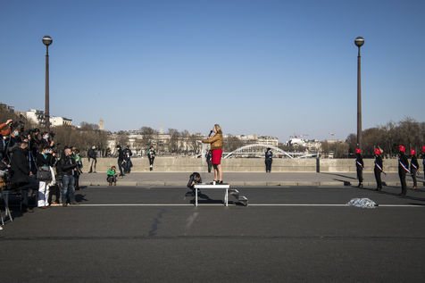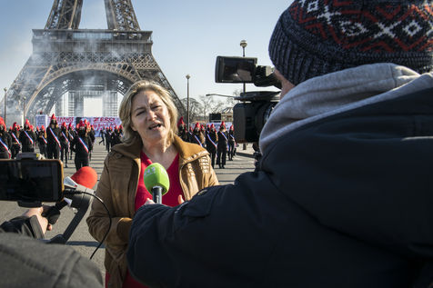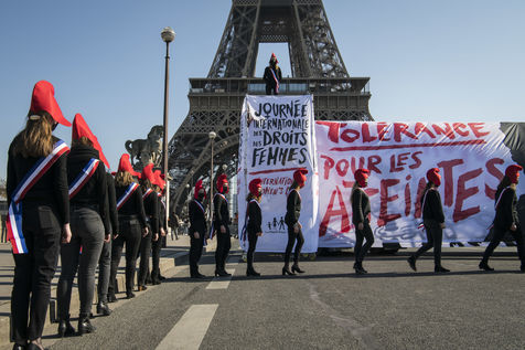 A la veille de la journée internationale des droits des femmes, La Manif Pour Tous s'est mobilisée contre la GPA et la PMA sans père. Invitant la presse 268 Mariannes ont participé à une scénographie et interpelé Emmanuel Macron contre les atteintes et les menaces pour les droits des femmes, aux pieds de la Tour Eiffel.