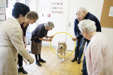 Pet therapy workshop with the dog Nova, in the fight against Alzheimer's disease. Espace Jeanne Garnier in Paris.