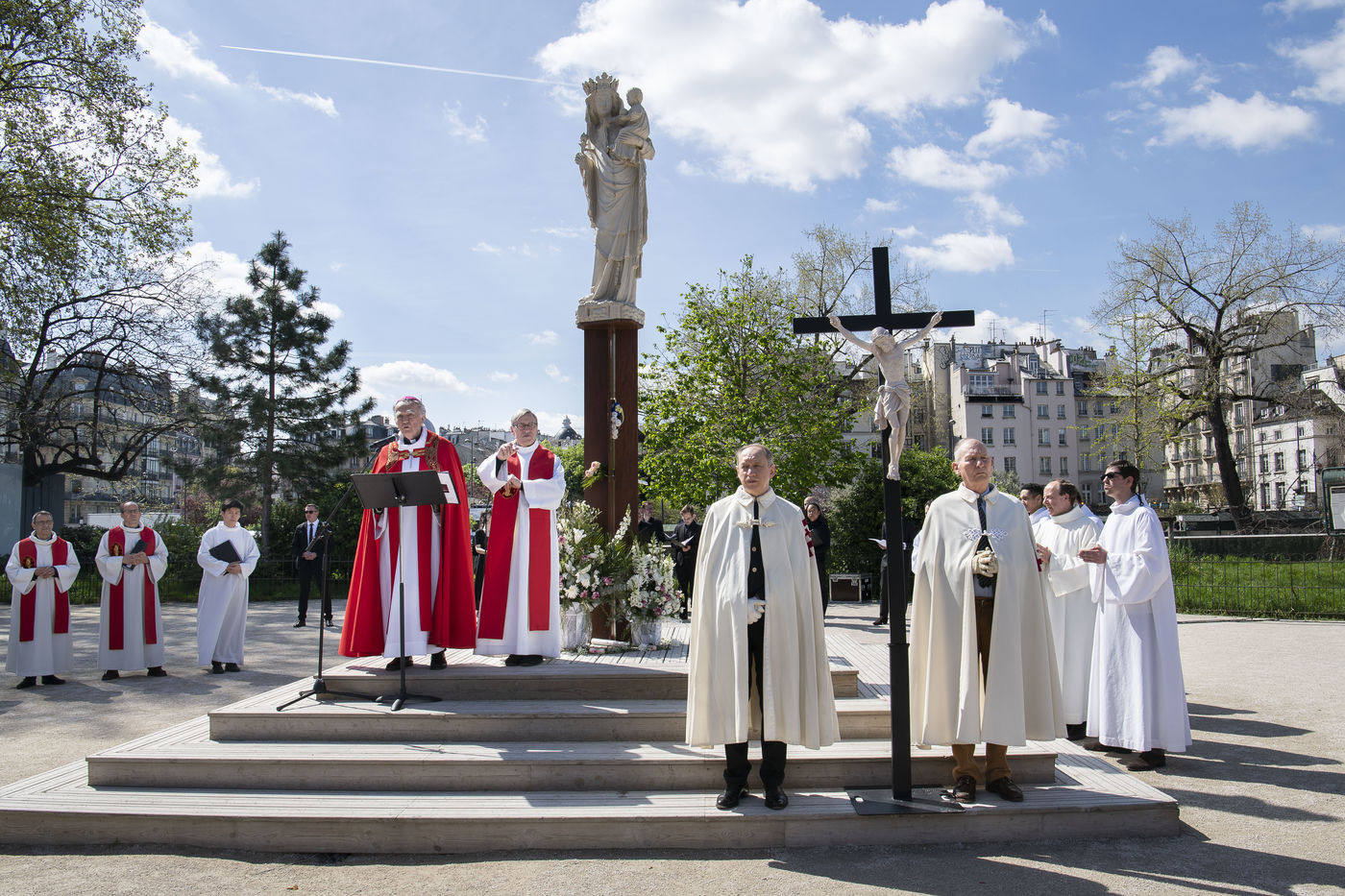 Semaine Sainte - vendredi Saint - meditation et veneration de La Croix sur le parvis de la cathédrale Notre-Dame de Paris.