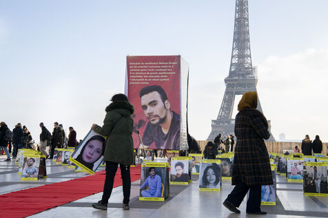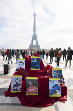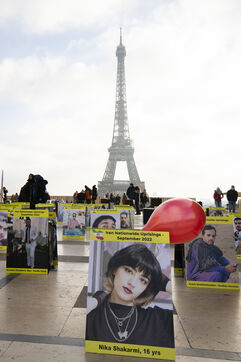 Journée internationale des droits de l'Homme : Rassemblement en soutien au soulevement en Iran, sur le parvis des droits de l'Homme au Trocadero, où sont exposés les portraits des victimes de la police et de l'Etat iranien.