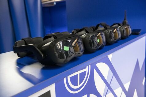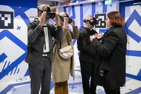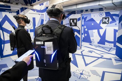 Inauguration de l'exposition-spectacle "Eternelle Notre-Dame" sous le parvis de la cathédrale Notre-Dame de Paris. Des visiteurs vivent l'expédition immersive en réalité virtuelle.