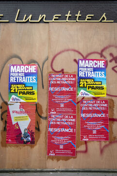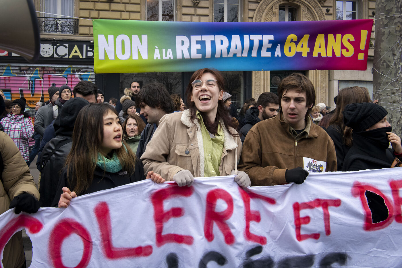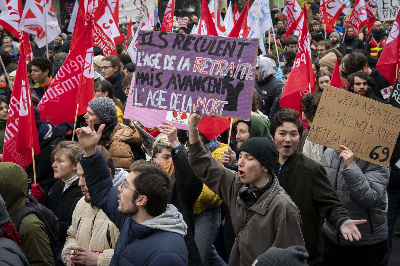 Manifestation contre la réforme des retraites. Première journée de mobilisation intersyndicale contre l'annonce du report de l'âge légal de la retraite à 64 ans, présenté par la première ministre Elisabeth Borne.