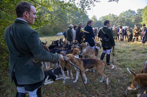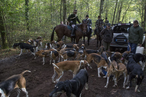 Chasse à courre en forêt de Chantilly avec une quinzaine de veneurs du Rallye Pic'Hardi Chantilly. Ils sont accompagnés d'une vingtaine de chiens de la race anglo-français dressés pour la recherche du chevreuil.