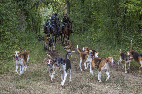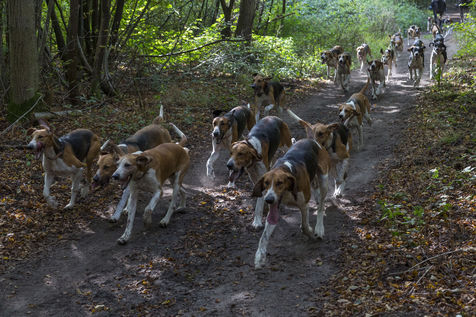 Hunting in the forest of Chantilly with about fifteen hunters of the Rallye Pic'Hardi Chantilly. They are accompanied by about twenty Anglo-French dogs trained to search for deer.