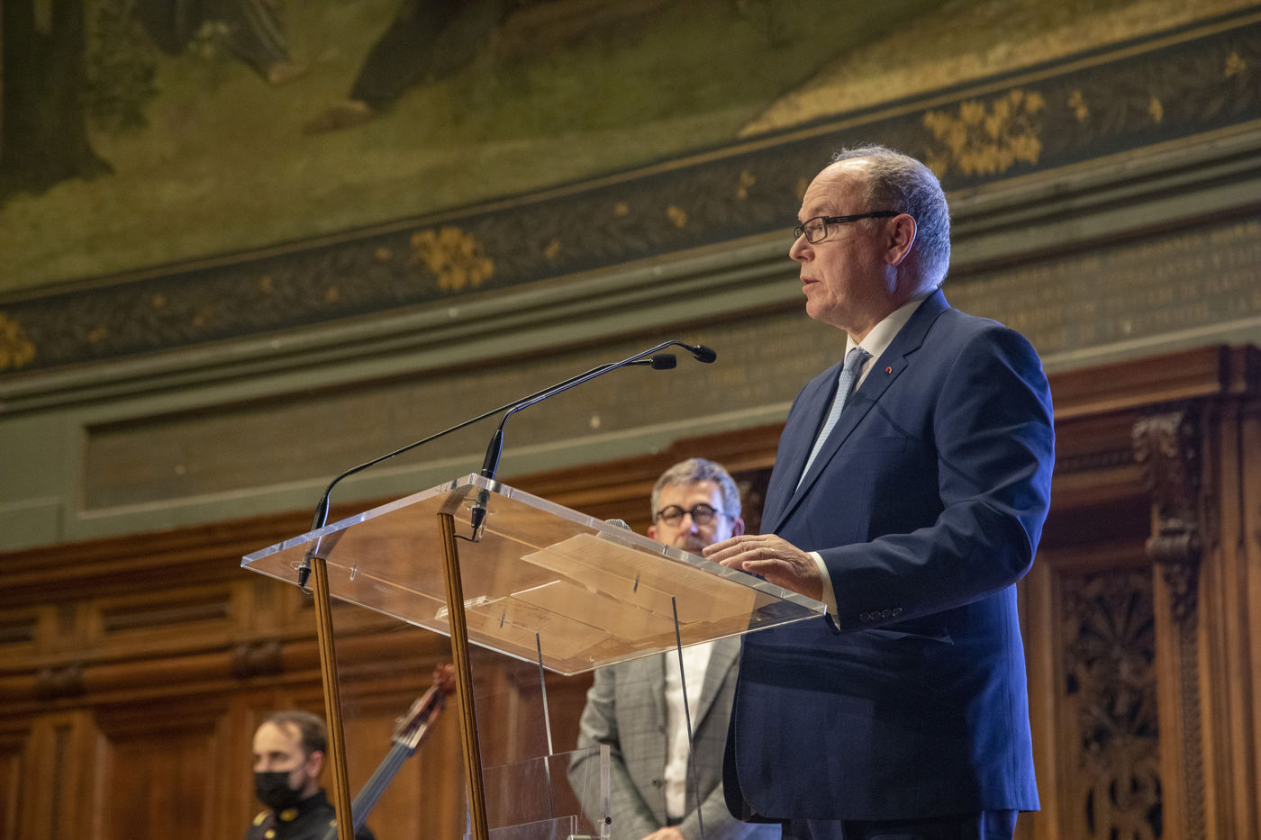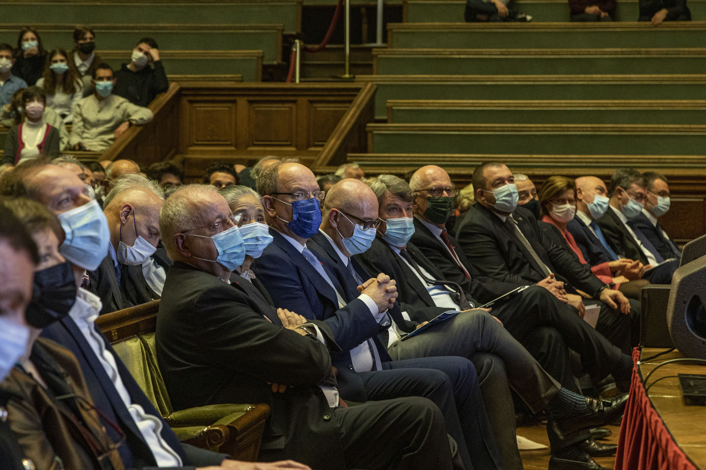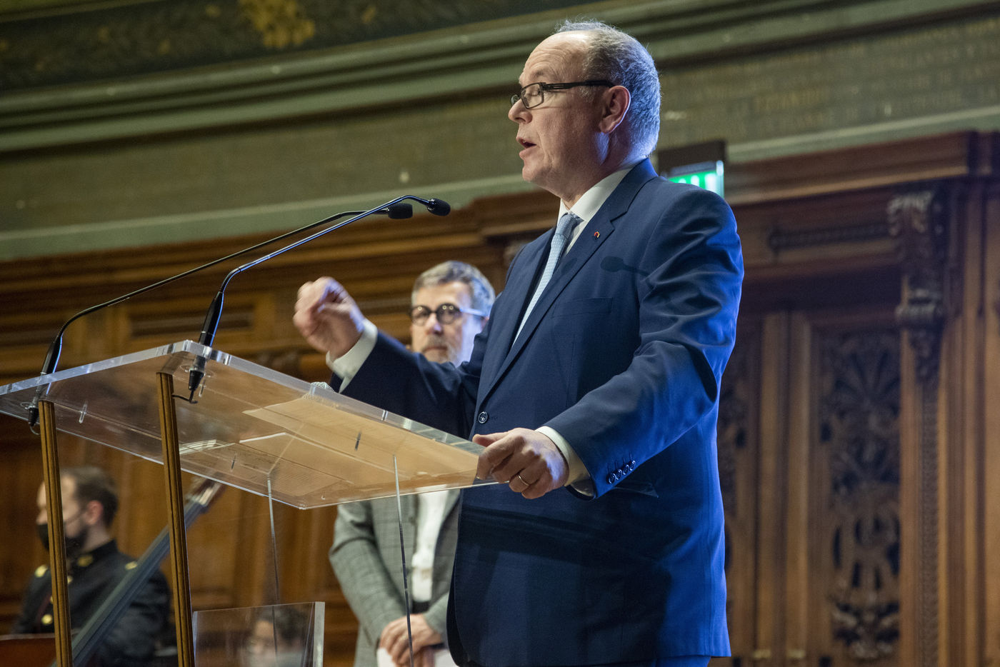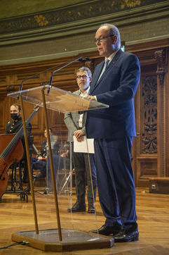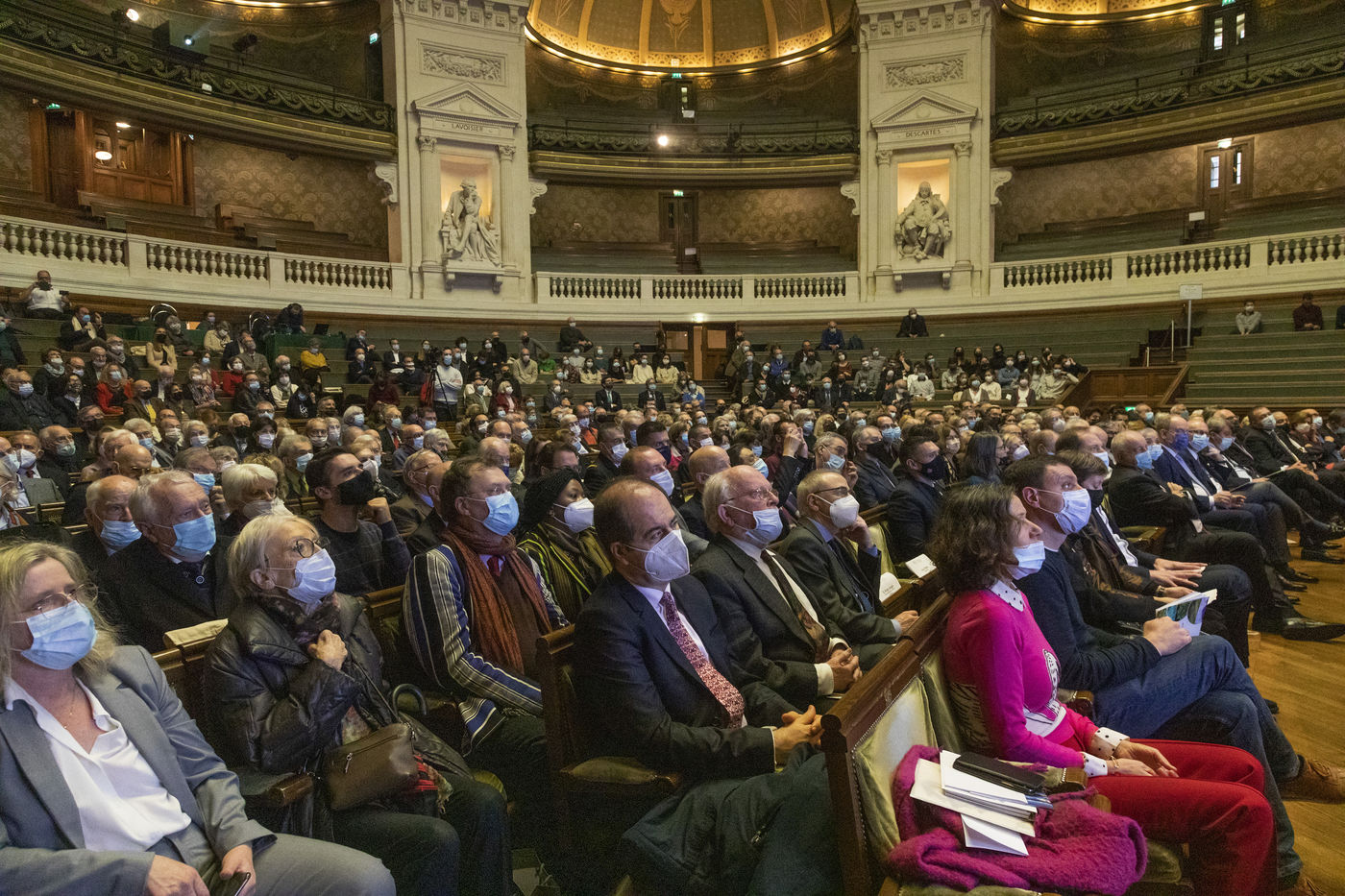 France, Paris, 2021-12-15, La Societe de Geographie, qui fête son bicentenaire, a organisé une cérémonie dans le grand amphitheatre de La Sorbonne en presence de personnalites dont SAS Albert II de Monaco, Erik Orsenna, Christian Prudhomme, au son de l'orchestre de la Garde Républicaine. L'évènement était animé par Jamy Gourmaud.