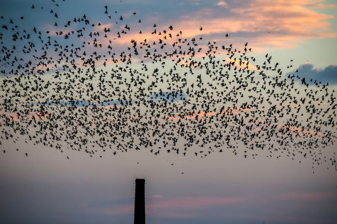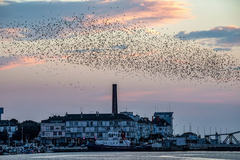 Every year, thousands of starlings settle around the submarine base of Saint-Nazaire. At sunset, they arrive in groups from the surroundings and gather above the port. They circle in tight rows in a majestic ballet. The municipality tries to chase them away so that they resume their migration towards the south, because they damage trees, vehicles, building facades, urban furniture, sidewalks with their droppings...