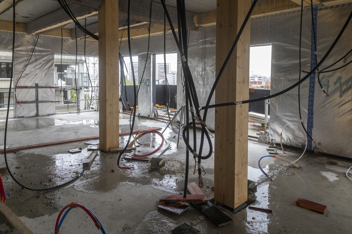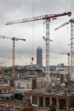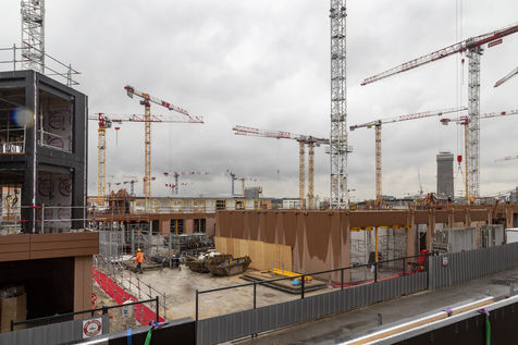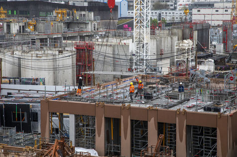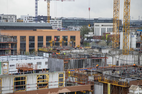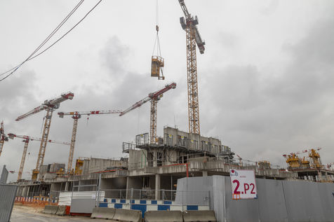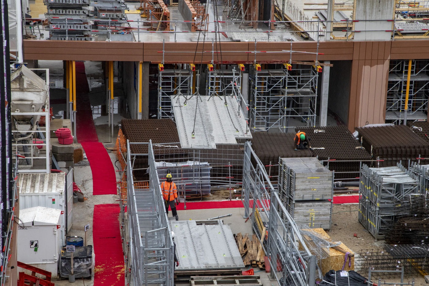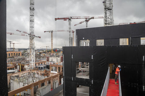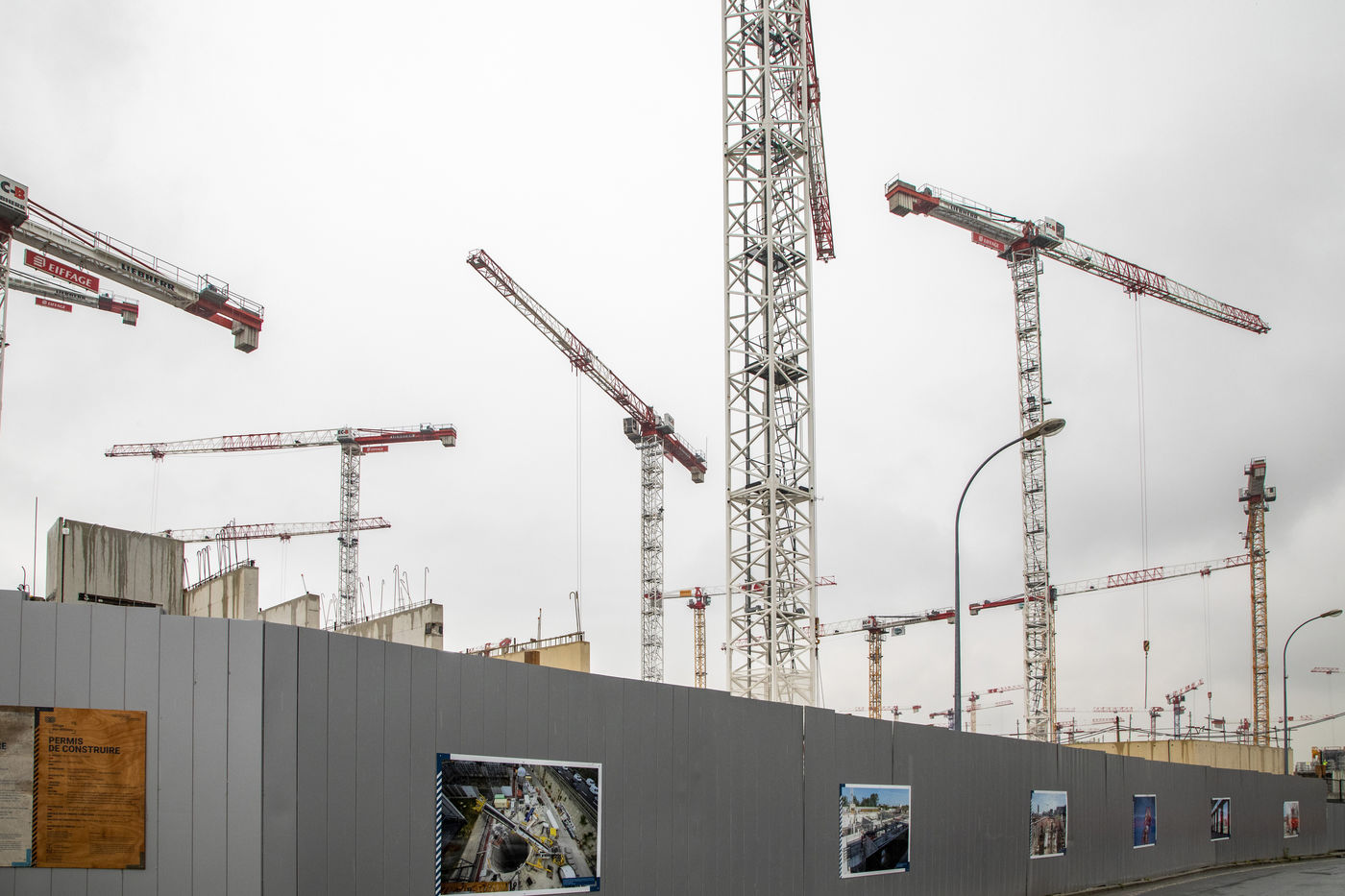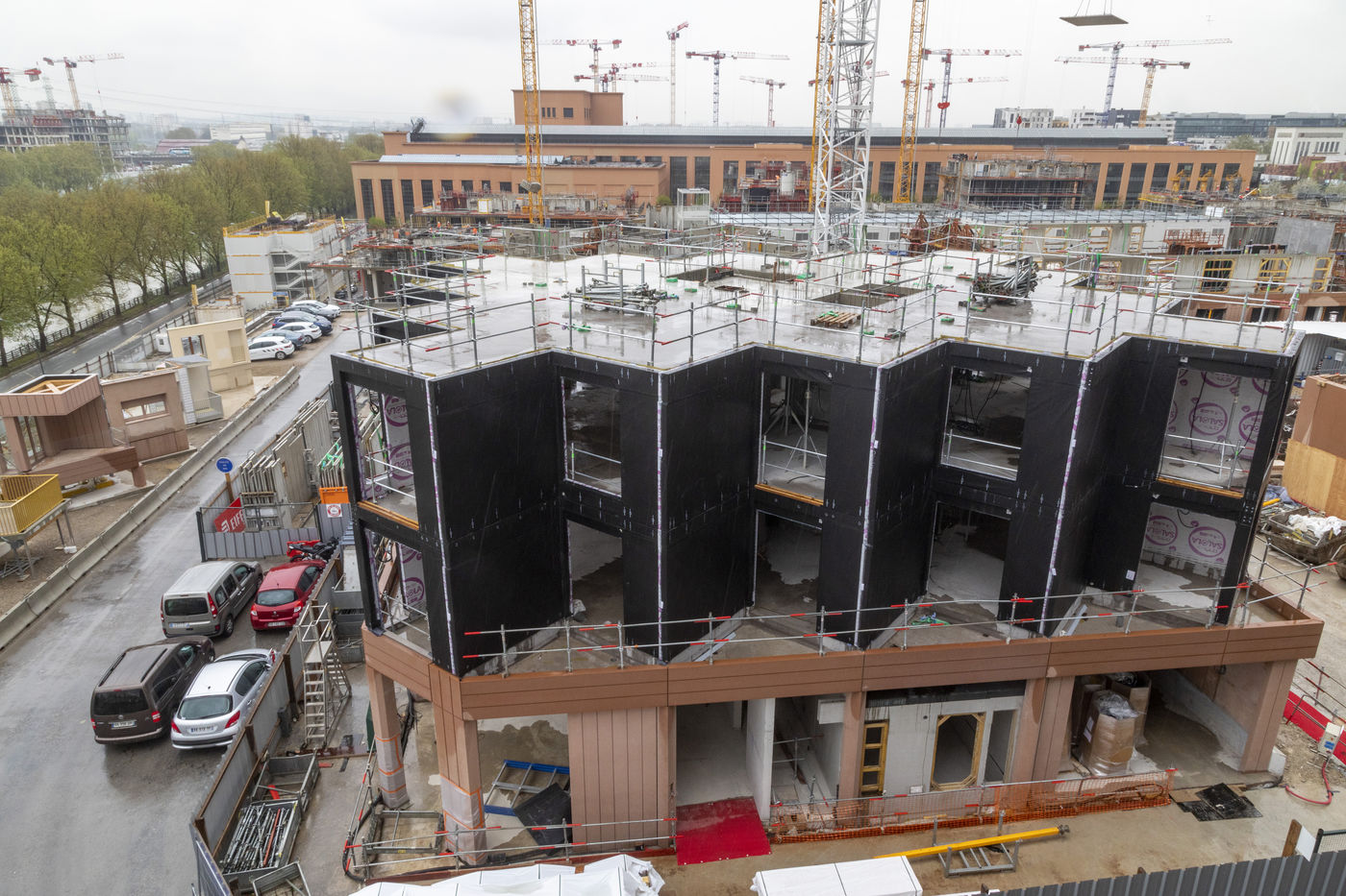 France, Saint-Ouen-sur-Seine, 2022-04-13. Work on the Athletes' Village, the site that will host more than 14,000 participants and their attendants at the Paris 2024 Olympic Games, began in April 2021. A real estate program of 527 housing units is being built little by little and the work is progressing. In sector E, one of the largest single-site projects in France, led by Eiffage, Nexity, and CDC Habitat, nearly 4,000 construction craftsmen are working on the construction of 19 buildings that will be completed on March 1, 2024. Photography by Caroline PAUX / Hans Lucas.