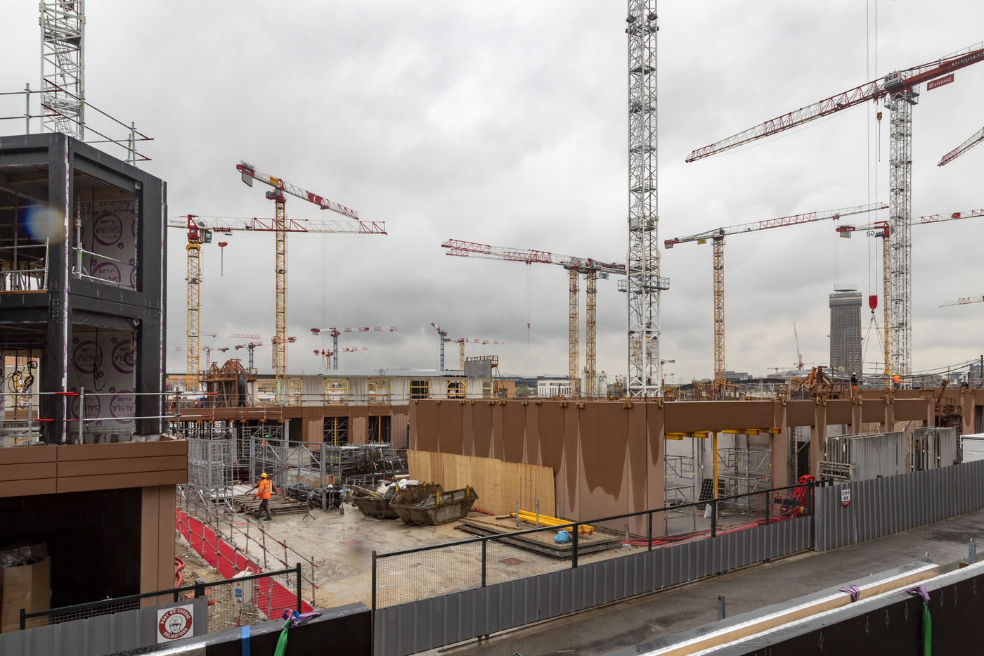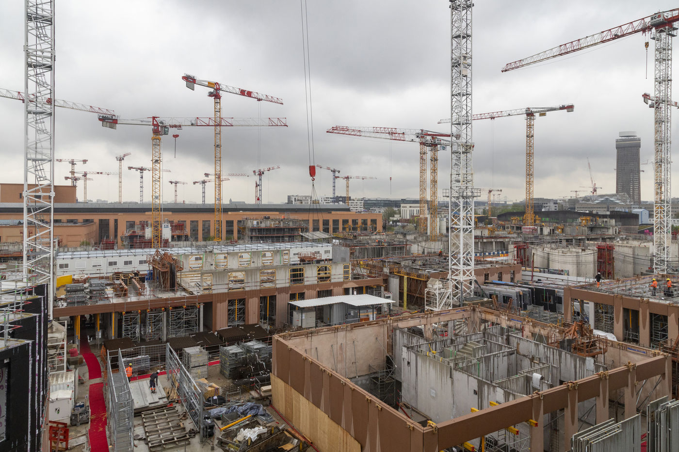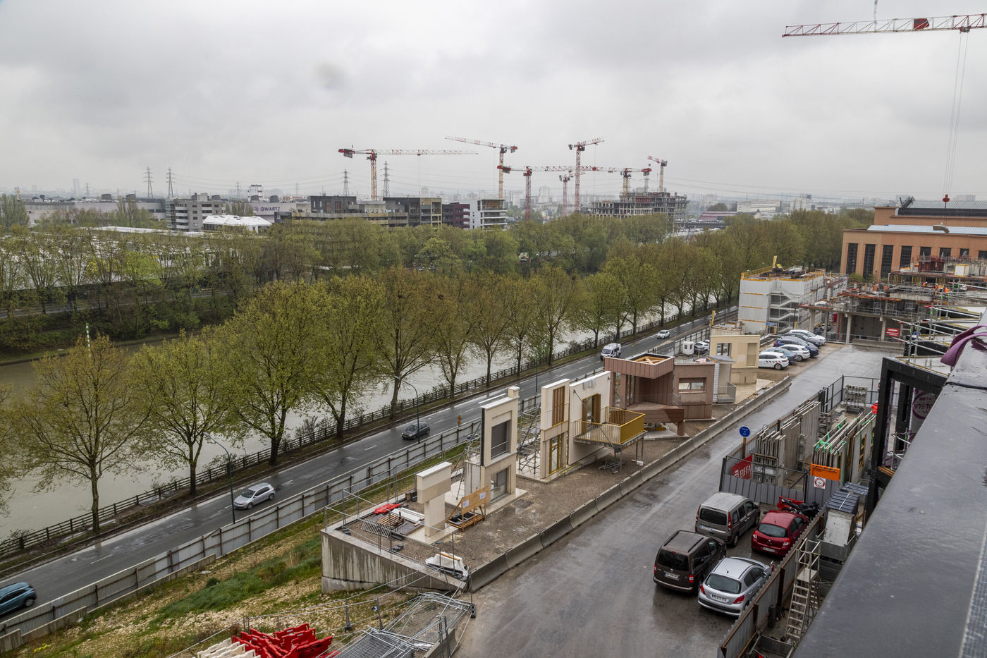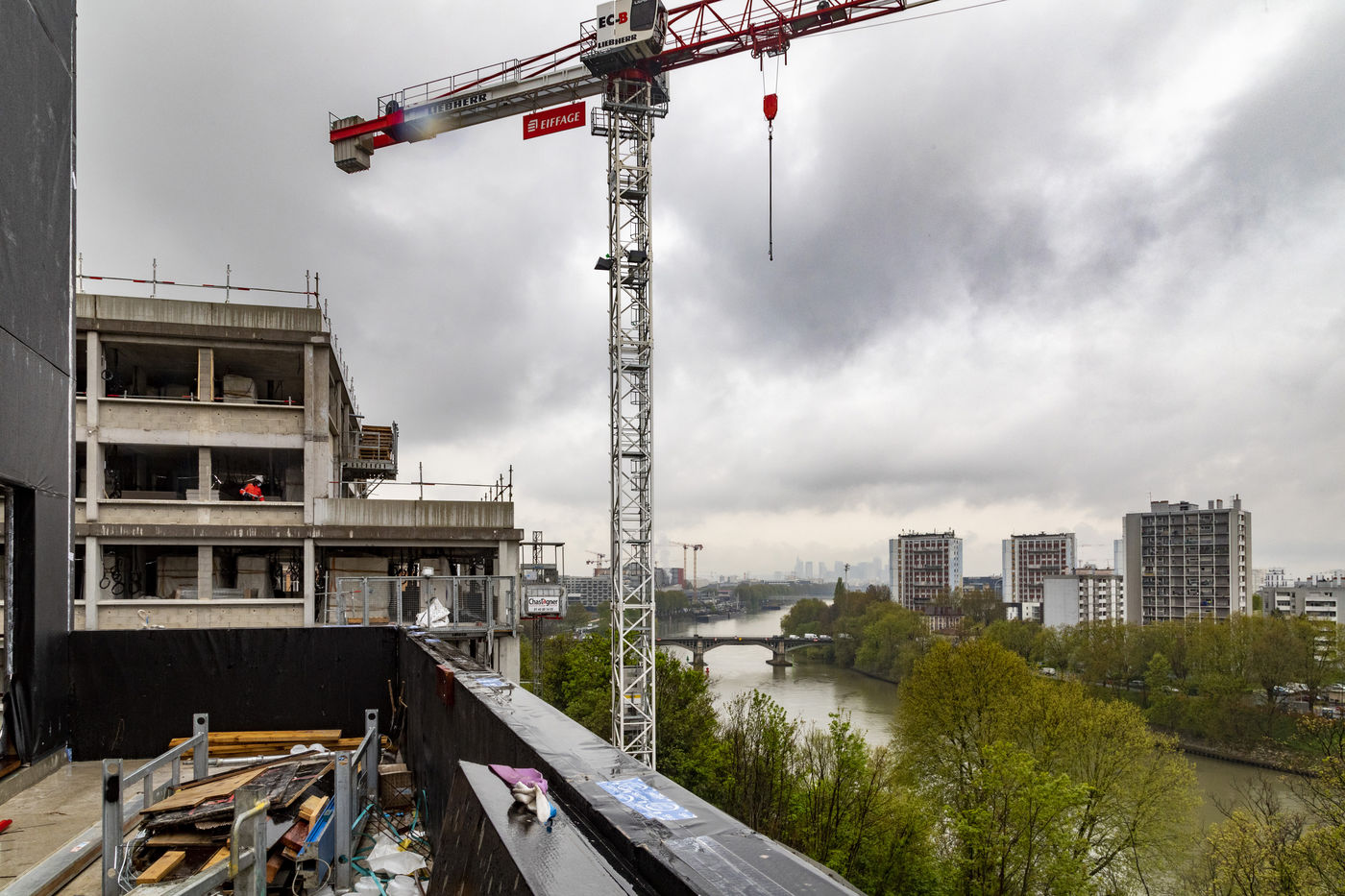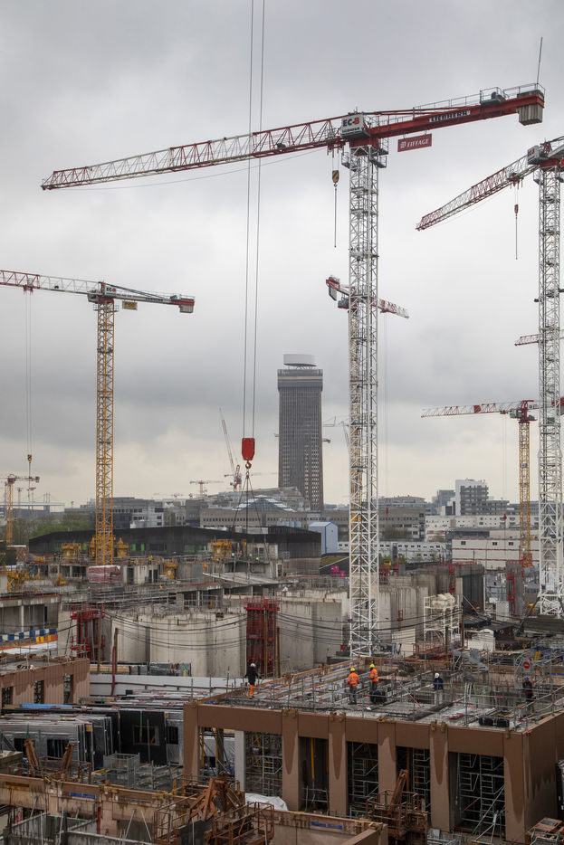 France, Saint-Ouen-sur-Seine, 2022-04-13. Les travaux du village des Athlètes, le site qui accueillera plus de 14 000 participants, et leurs accompagnants, aux Jeux Olympiques Paris 2024, ont démarré en avril 2021. Un programme immobilier de 527 logements voit le jour petit à petit et les travaux progressent. Au niveau du secteur E, un des plus grands chantiers mono site de France, mené par Eiffage, Nexity, CDC Habitat, près de 4 000 artisans du bâtiment travaillent sur la construction de 19 immeubles qui devront Être termine le 1er mars 2024. Photographie par Caroline PAUX / Hans Lucas