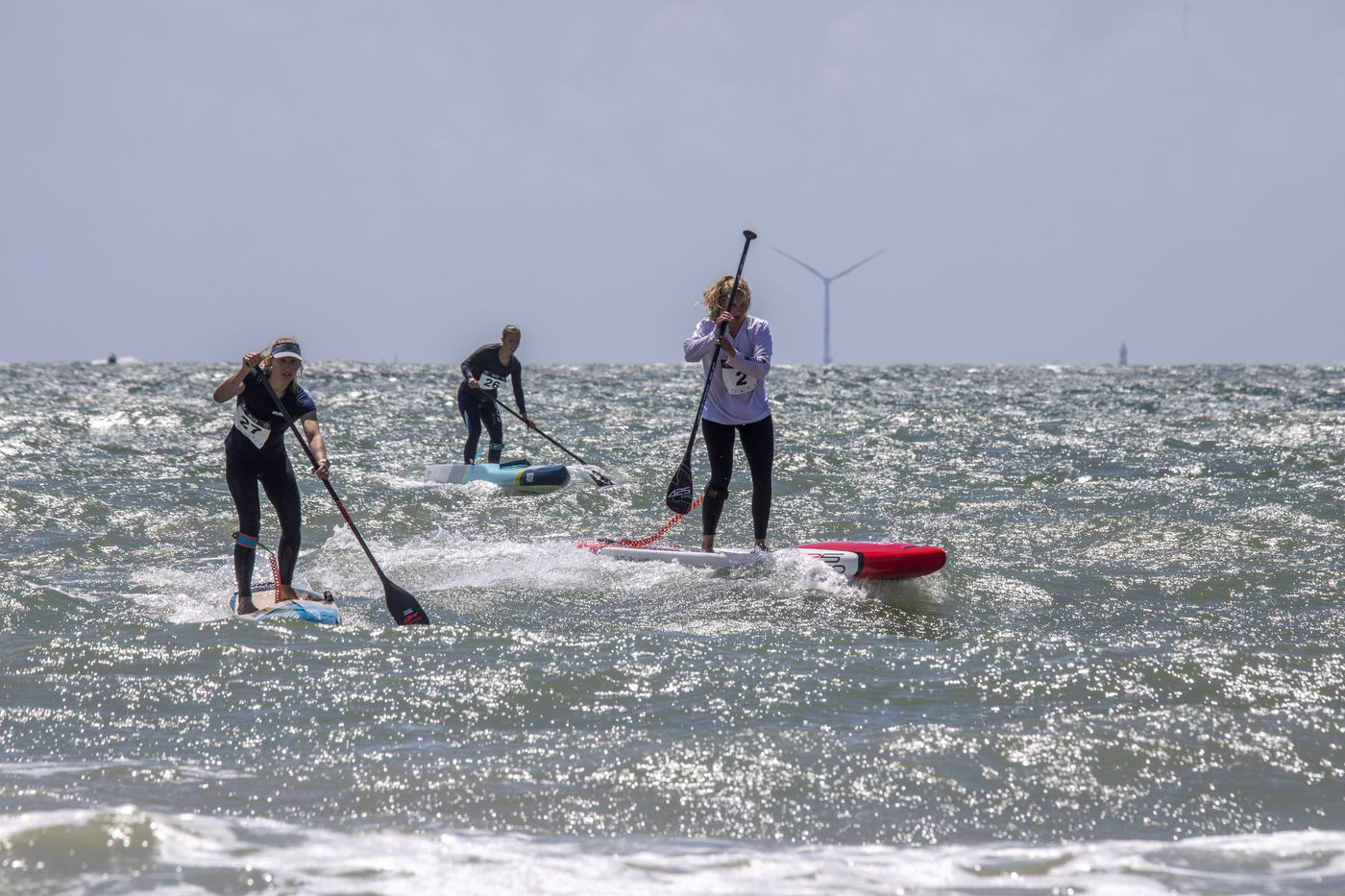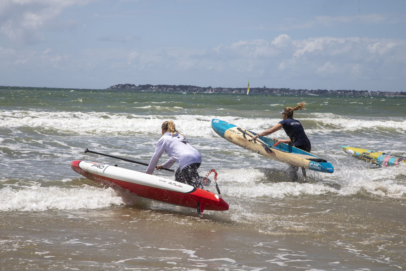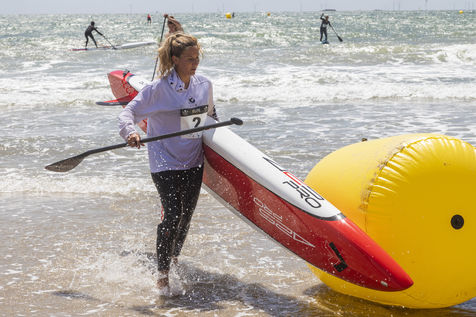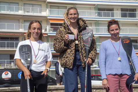 France, Pornichet, 2022-06-25. Les meilleures athlètes françaises du paddle se sont retrouvées à Pornichet pour la 5e édition du Paddle Trophy. Elles ont notamment participé au Beach Race Elite, une course technique rendue très difficile par les conditions météo, vent et vague. Mélanie Lafenêtre, championne de France longue distance 2021, s impose en 1re place, suivie de Iona Rivet, double vice-championne de France en longue distance et en sprint, et d Anaïs Guyomarch, championne de France Open dames. la vice-championne du monde Amandine Chazot, est 4e. Photographie par Caroline Paux / Hans Lucas.
