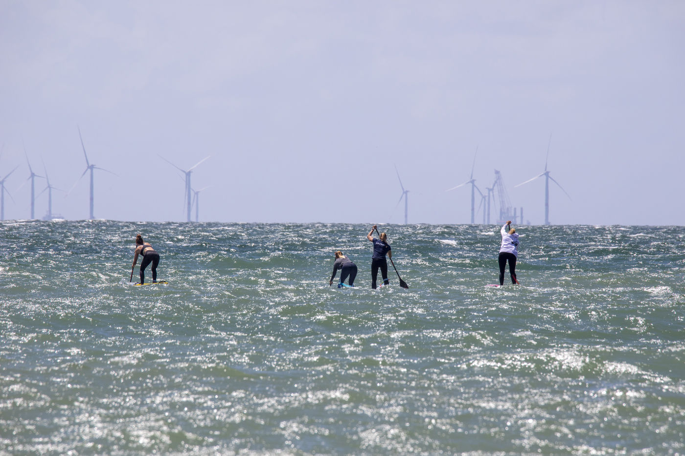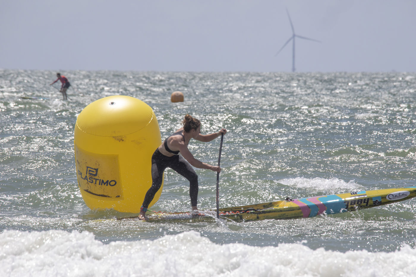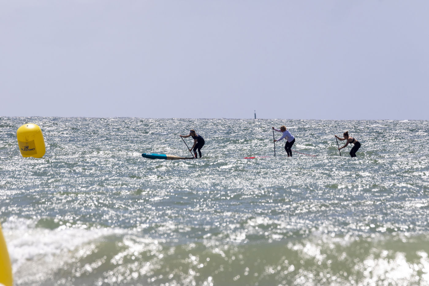 France, Pornichet, 2022-06-25. Les meilleures athlètes françaises du paddle se sont retrouvées à Pornichet pour la 5e édition du Paddle Trophy. Elles ont notamment participé au Beach Race Elite, une course technique rendue très difficile par les conditions météo, vent et vague. Mélanie Lafenêtre, championne de France longue distance 2021, s impose en 1re place, suivie de Iona Rivet, double vice-championne de France en longue distance et en sprint, et d Anaïs Guyomarch, championne de France Open dames. la vice-championne du monde Amandine Chazot, est 4e. Photographie par Caroline Paux / Hans Lucas.