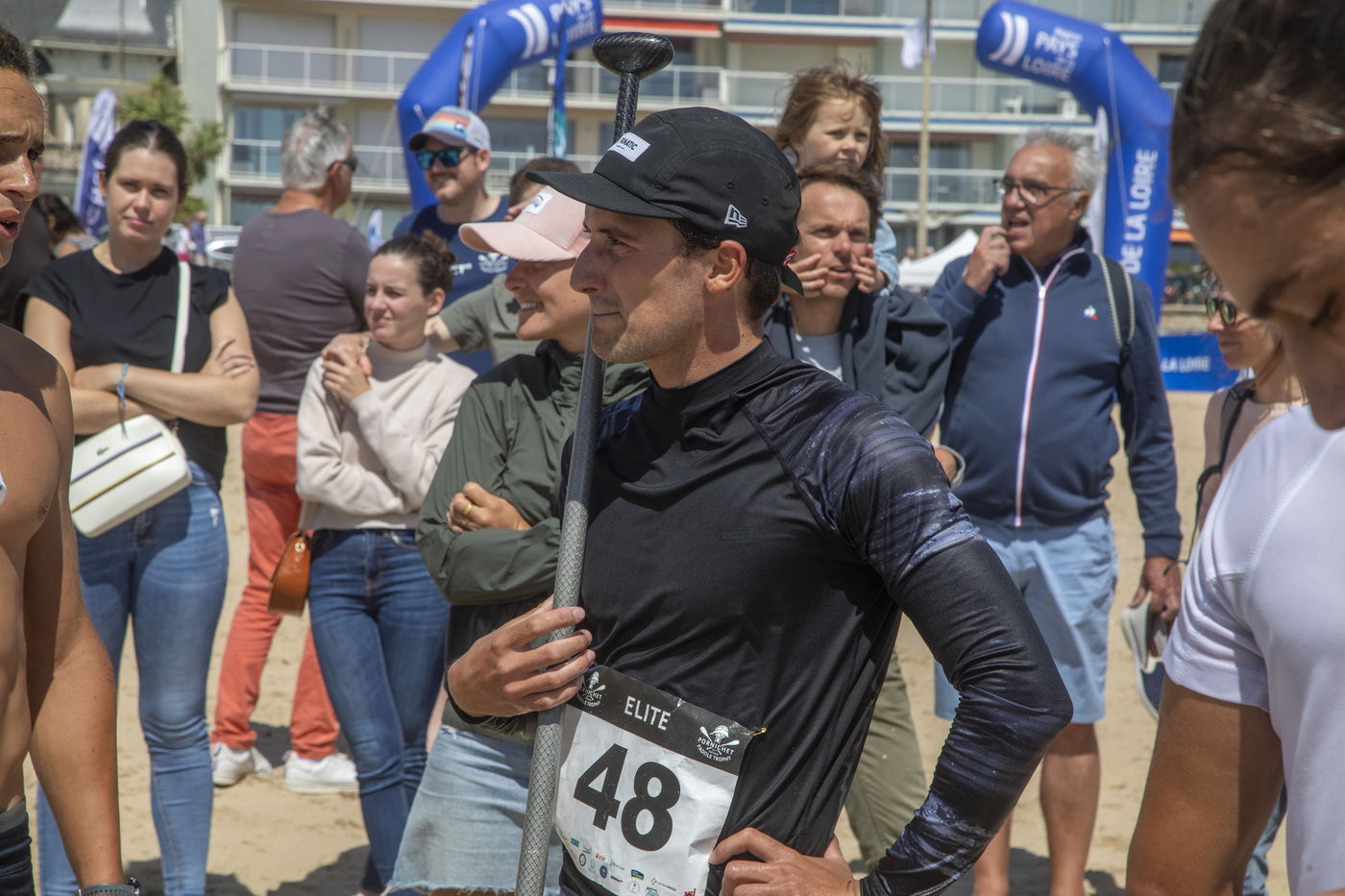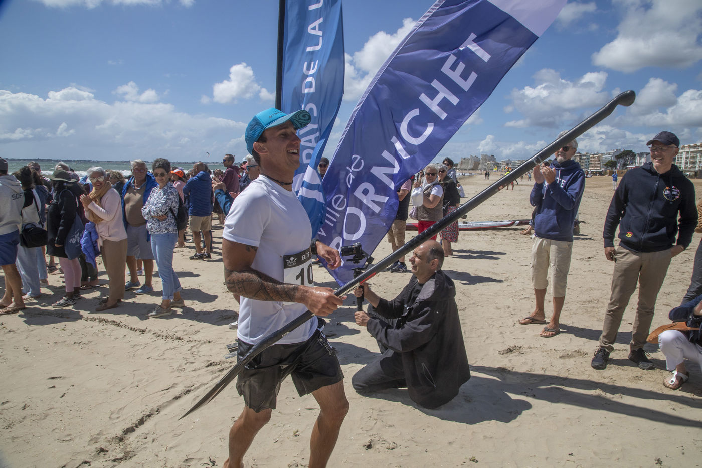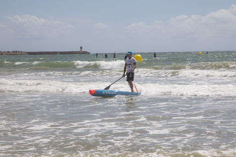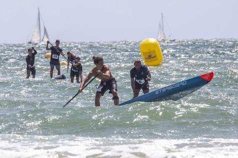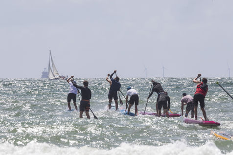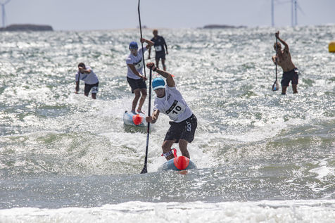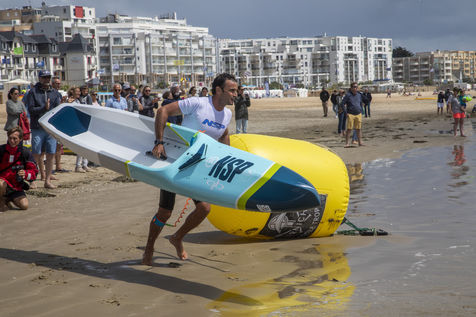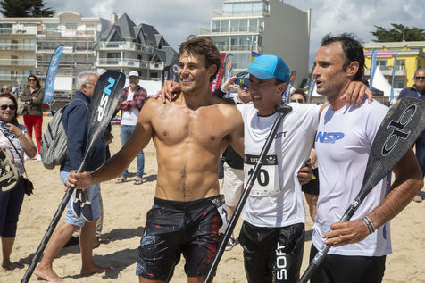 France, Pornichet, 2022-06-25. Les meilleurs athlètes mondiaux du paddle se sont retrouvés à Pornichet pour la 5eédition du Paddle Trophy. Ils ont notamment participé au Beach Race Elite, une course technique rendue très difficile par les conditions météo, vent et vague. Trois Néo-Calédonniens arrivent en tête. Noïc Garioud, un des meilleurs pagayeurs au monde, remporte l?épreuve, devant un autre grand champion, Titouan Puyo, plusieurs fois champions de France, d?Europe et du monde, et le jeune espoir Clément Colmas, également champion de Wingfoil. En 4e position arrive le champion australien Ty Judson.