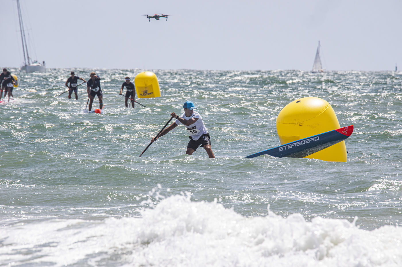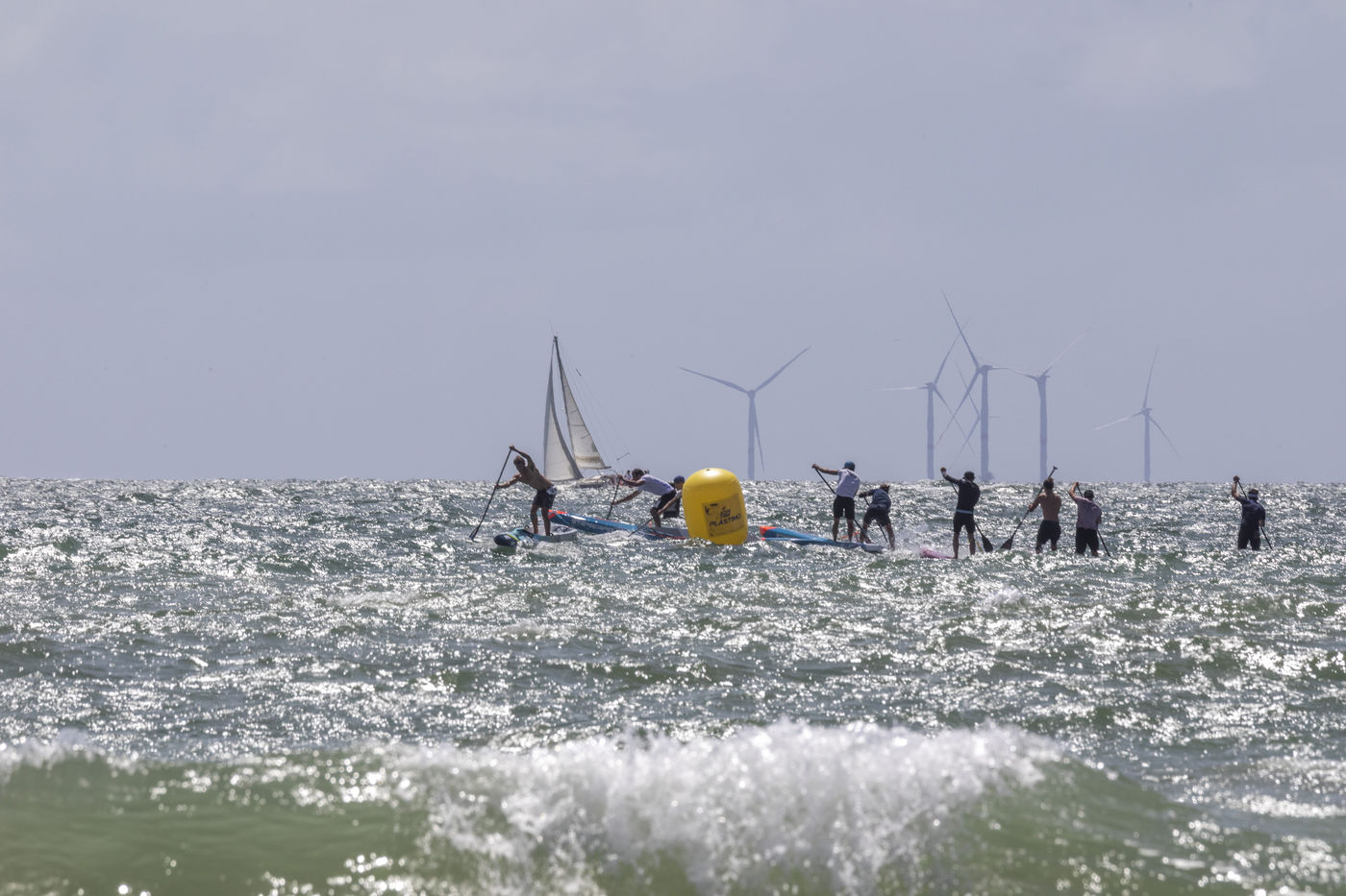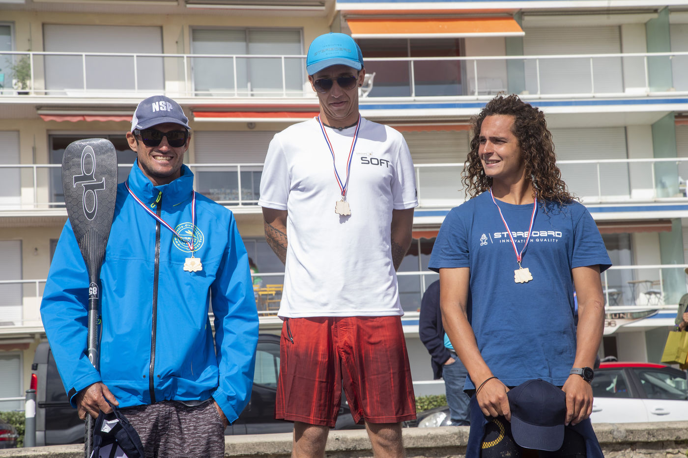 France, Pornichet, 2022-06-25. Les meilleurs athlètes mondiaux du paddle se sont retrouvés à Pornichet pour la 5eédition du Paddle Trophy. Ils ont notamment participé au Beach Race Elite, une course technique rendue très difficile par les conditions météo, vent et vague. Trois Néo-Calédonniens arrivent en tête. Noïc Garioud, un des meilleurs pagayeurs au monde, remporte l?épreuve, devant un autre grand champion, Titouan Puyo, plusieurs fois champions de France, d?Europe et du monde, et le jeune espoir Clément Colmas, également champion de Wingfoil. En 4e position arrive le champion australien Ty Judson.
