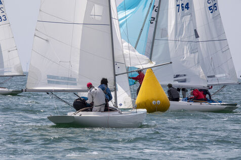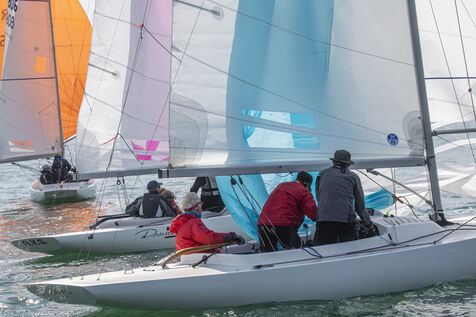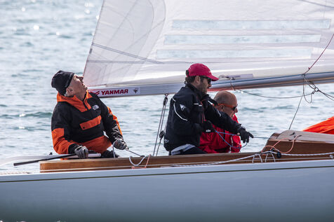France, La Baule, 2023/05/17. Début du Derby Dragon international de La Baule, organisé par le Yacht-club de La Baule du 17 au 20 mai 2023. Six nations sont représentées : douze bateaux anglais, trois Irlandais, quatre Hollandais, trois Belges, un Allemand et douze Français. Au terme de la première journée, l?équipage de Douanenez composé de Frédéric et Charlotte Gourlaouen et Jean-François Le Goff, est en tête chez les professionnels. Photographie par Caroline Paux / Hans Lucas.
